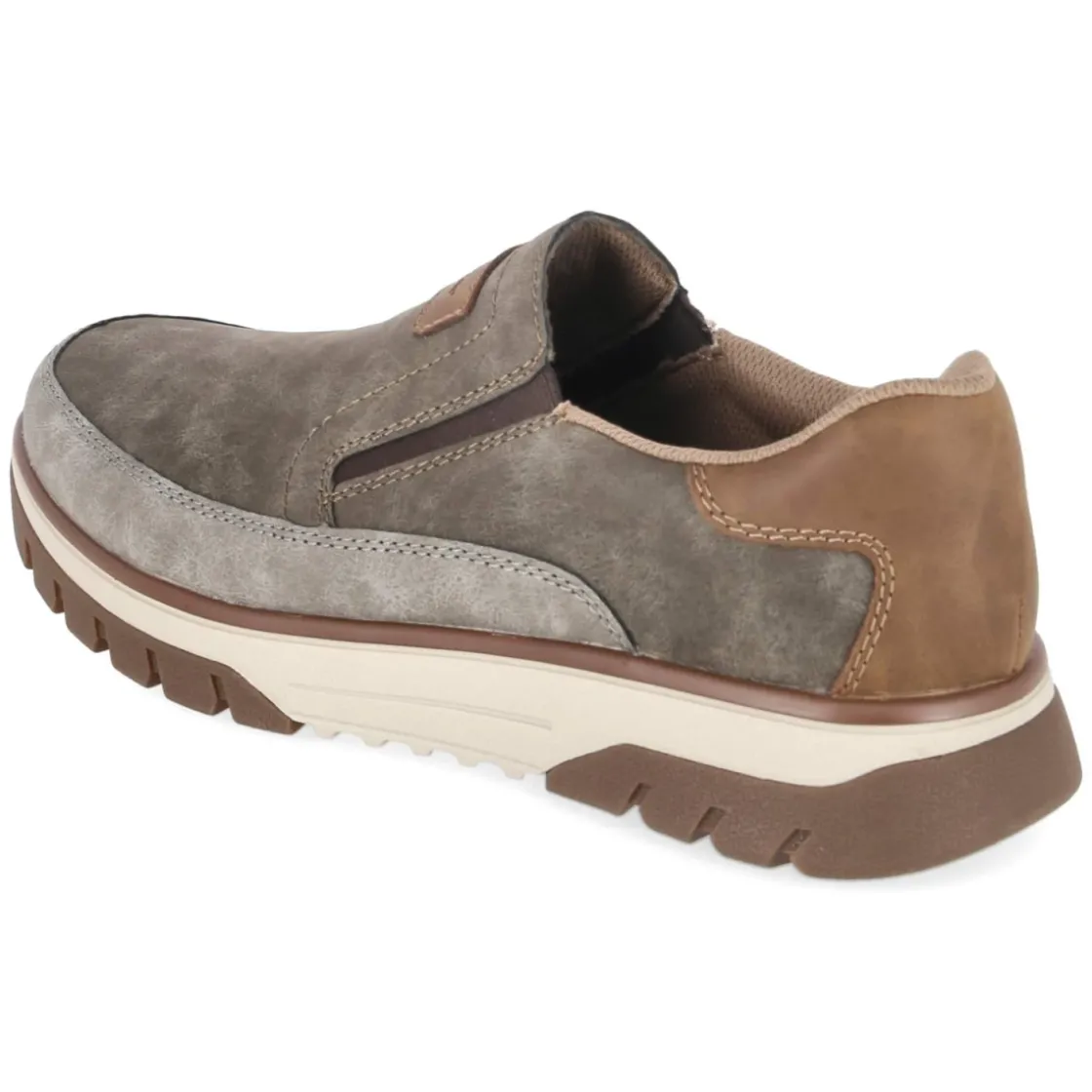 Der Herren-Slipper von Rieker verbindet sportliche Optik mit durchdachtem Komfort. Das melierte Obermaterial aus Synthetik in Taupe zeigt sich besonders pflegeleicht, während die runde Spitze und seitliche Elastikeinsätze ein unkompliziertes Hineinschlüpfen ermöglichen. Ein gepolsterter Einstieg, das komfortable Wechselfußbett und eine flexible Profilsohle mit rutschhemmenden Elementen sorgen für angenehmes Laufgefühl im Alltag. Verstärkter Fersen- und Zehenbereich geben zusätzliche Stabilität, die flexible Laufsohle unterstützt natürliche Abrollbewegungen. Das Modell fällt schmaler aus und unterstreicht mit klarer Linienführung eine moderne, sportliche Note. Modetipp: zu schmalen Chinos in Grau und einem leichten Strickpullover kombinieren, dazu ein Ledergürtel in Mittelbraun für einen ruhigen, urbanen Look.