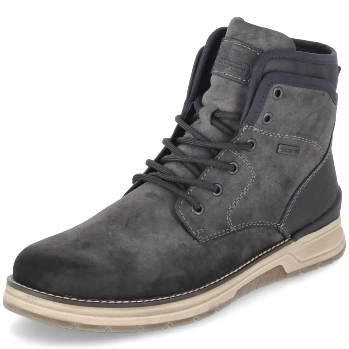 Der Winterboot von Rieker für Herren präsentiert sich in einem zeitlosen Grauton und verbindet Schutz und Komfort für kalte Tage. Das wasserfeste, zugleich atmungsaktive Obermaterial aus Synthetik hält Nässe zuverlässig fern, während das kuschelige Warmfutter für wohlige Temperaturen sorgt. Eine runde Schuhspitze und die Kombination aus Schnürsenkeln mit zusätzlichem Reißverschluss ermöglichen passgenauen Halt und bequemes An- und Ausziehen. Das gepolsterte, herausnehmbare Fußbett entlastet auf langen Wegen, unterstützt vom verstärkten Fersenbereich und einer flexiblen, rutschhemmenden Profilsohle. Da der Leisten schmaler ausfällt, entsteht eine schlanke Silhouette mit sicherem Sitz. Ein funktionaler Begleiter für Erwachsene, wenn Wetter und Alltag fordern. Modetipp: Zu dunkler Raw Denim und einem grauen Wollmantel entsteht ein urbaner Winter-Look, der dezent und wertig wirkt.