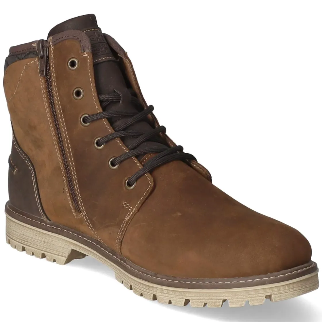 Der Herren-Winterboot von Rieker vereint robustes Design und hohen Tragekomfort. Das Obermaterial aus Leder und Synthetik zeigt sich in warmem Braun und wird von markanten Ziernähten und TEX-Markendetails akzentuiert. Dank wasserfester, zugleich atmungsaktiver Ausstattung sowie wasserabweisender Oberfläche bleiben Füße auch an nassen Tagen angenehm trocken. Ein kuscheliges Warmfutter und eine textile Decksohle sorgen für behagliche Wärme, während die verstärkte Ferse Stabilität bietet. Die runde Spitze, eine flexible, rutschhemmende Profilsohle und die Kombination aus Schnürung und zusätzlichem Reißverschluss erleichtern den Alltag bei winterlichen Bedingungen. Mit Anziehlasche gelingt der Einstieg noch leichter. Die Passform fällt normal aus und eignet sich damit verlässlich für den täglichen Einsatz. Modetipp: Zu dunklem Denim, Wollsocken und Parka getragen entsteht ein zeitloser, urbaner Winter-Look.