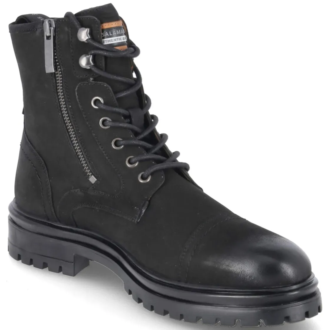 Der Winterboot von Salamander in tiefem Schwarz vereint robuste Funktion und zeitlose Ästhetik. Langlebiges Echtleder bildet das Obermaterial, die runde Spitze und der verstärkte Zehen- sowie Fersenbereich verleihen zusätzliche Stabilität. Innen hält ein warmes Futter die Füße an kalten Tagen angenehm temperiert, während die textile Decksohle für komfortables Auftreten sorgt. Ein 4 cm hoher Blockabsatz unterstützt einen sicheren Stand, die rutschfeste Profillaufsohle gibt zuverlässigen Grip auf winterlichen Untergründen. Praktisch sind Schnürsenkel in Kombination mit zwei seitlichen Reißverschlüssen für müheloses An- und Ausziehen. Der Herrenboot fällt schmaler aus; es empfiehlt sich, eine Nummer größer zu wählen. Ein Alltagspartner für Erwachsene, der Stil und Schutz verbindet. Modetipp: Mit dunklem Denim, grobem Strickpullover und Wollmantel wirkt der Boot besonders souverän, ein gekrempelter Saum setzt die Silhouette markant in Szene.