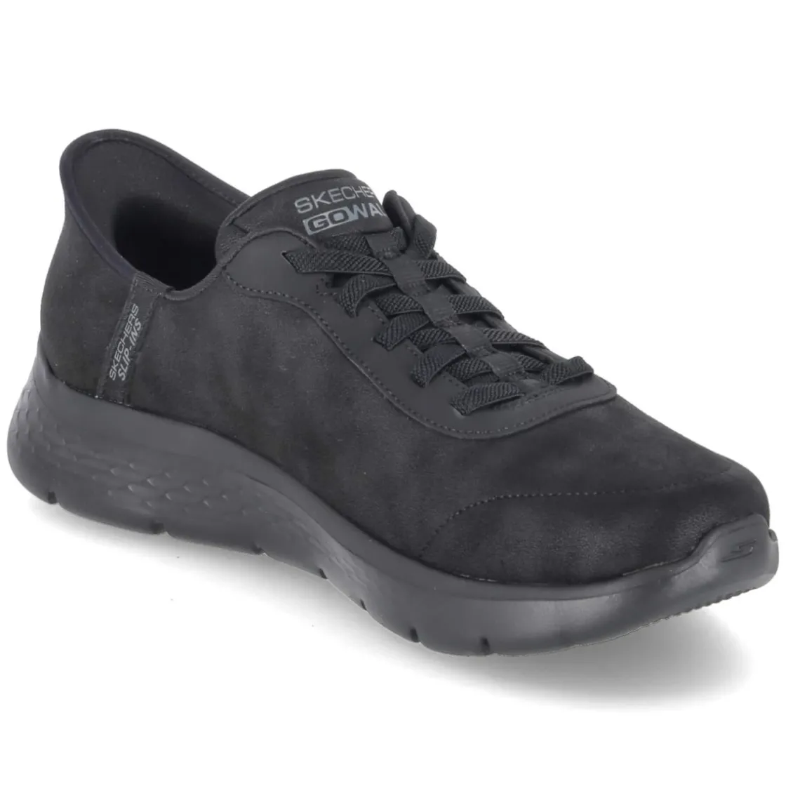 Der Skechers Slip-Ins SMOOTH MOTION für Herren vereint Komfort und Alltagstauglichkeit in einer cleanen, schwarzen Silhouette. Das textile Obermaterial mit runder Spitze liegt leicht am Fuß, während die beste Memory-Foam-Fußbettung jeden Schritt weich abfedert. Dank Slip-Ins-Konstruktion und gepolsterter Einstiegshilfe gelingt der Einstieg mühelos; ein Elastikband in Schnüroptik sorgt für einen sportiven Akzent. Die GO WALK FLEX Plattform stützt dynamische Abrollbewegungen, verstärkte Zonen an Ferse und Zehen erhöhen die Langlebigkeit. Eine flexible, rutschfeste Laufsohle bietet sicheren Halt auf verschiedensten Untergründen. Maschinenwaschbar und mit Decksohle aus Textil ausgestattet, fällt dieses Modell normal aus und passt damit zuverlässig. Modetipp: Mit schmalen Chinos und einem strukturierten Strickpullover entsteht ein smarter Casual-Look, der im Büro wie auf Reisen überzeugt.