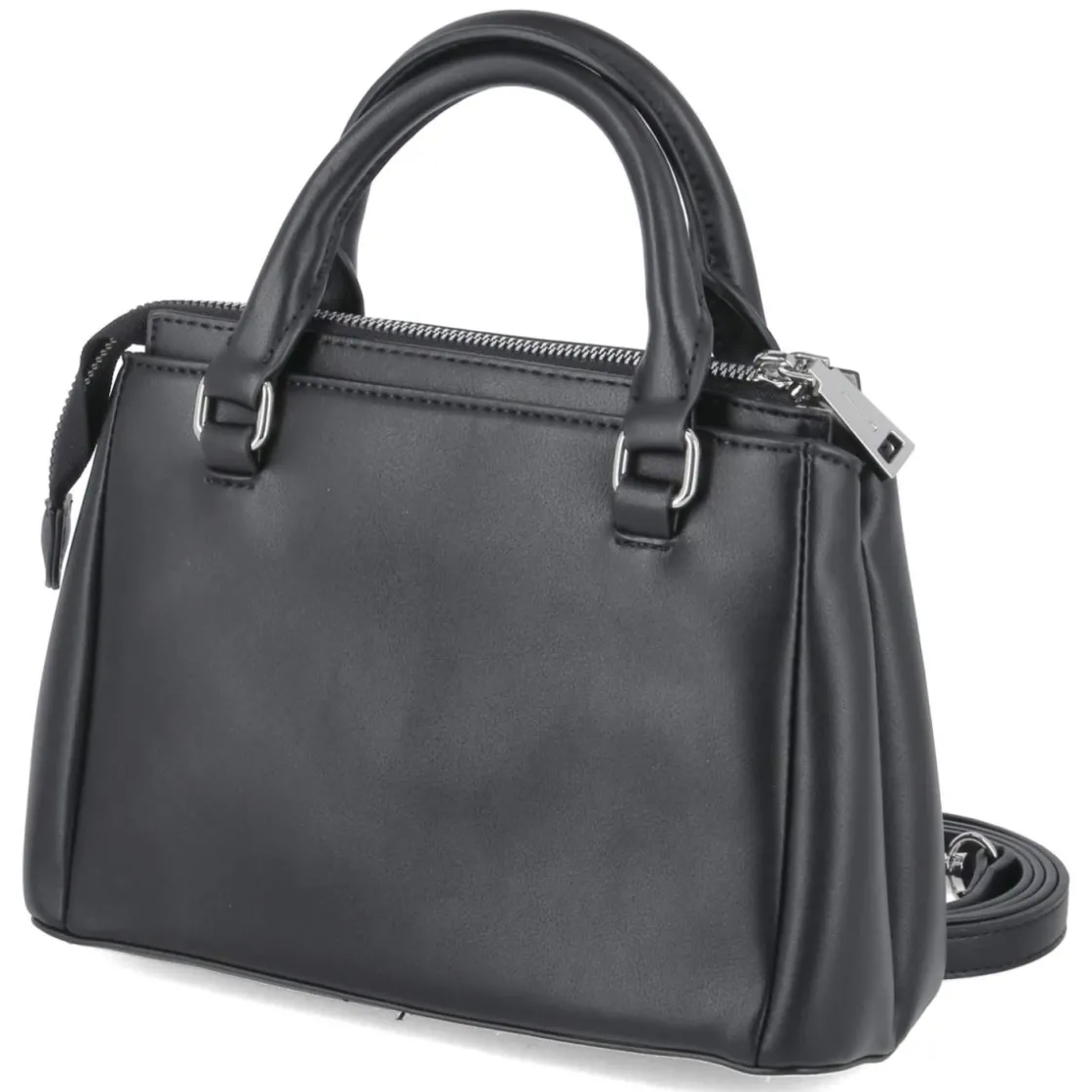 Die Handtasche ELIENE vereint klare Linien mit einem markanten Auftritt in klassischem Schwarz. Mit kompakten Maßen von ca. 16 x 23 x 9 cm und einem Volumen von rund 3 Litern bietet sie genug Raum für Essentials, bleibt aber elegant proportioniert. Das Frontlogo aus Nieten setzt einen modernen Akzent, während ein verstärkter Boden Formstabilität garantiert. Zwei Henkel sorgen für einen souveränen Griff, ein Reißverschluss schließt den Inhalt sicher. Innen ist das Modell zweigeteilt und durch zwei Steckfächer sowie ein RV-Fach übersichtlich organisiert. Der verstellbare Trageriemen bis ca. 125 cm erweitert die Tragevarianten von Hand über Schulter bis Crossbody. Modetipp: Ton-in-Ton mit schwarzer Zigarettenhose und feiner Strickware getragen entsteht ein puristischer Look mit subtiler Rock-Attitüde.