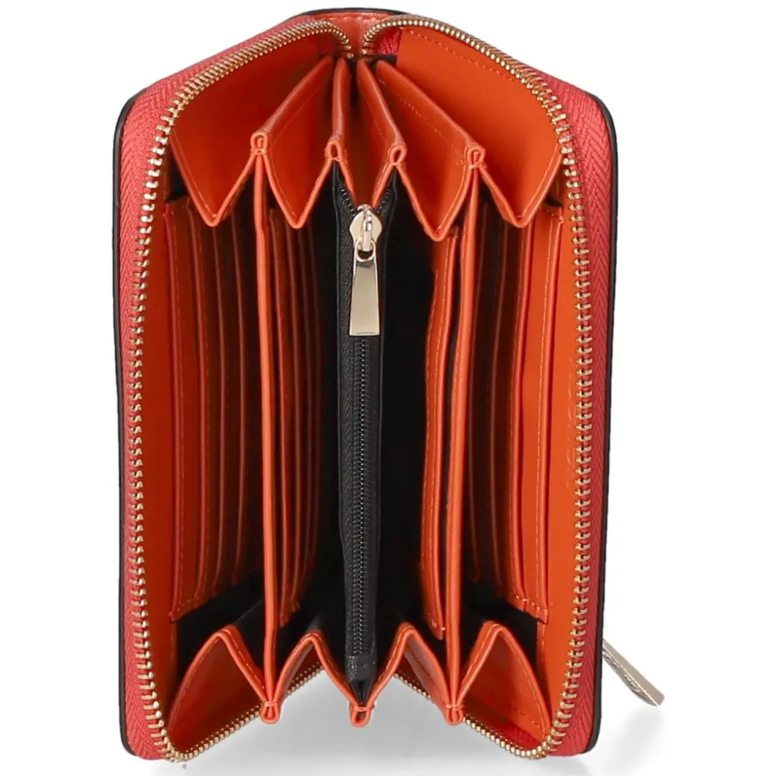Leuchtendes Orange trifft auf elegante Metalltöne: Diese Damen-Geldbörse setzt mit goldglänzenden Highlights ein stilvolles Statement. Das kompakte Format von ca. 10 x 15 x 3 cm liegt angenehm in der Hand und passt mühelos in kleine Handtaschen. Ein rundum laufender Reißverschluss schützt das Hauptfach, während ein praktisches Reißverschlussaußenfach schnellen Zugriff auf Tickets oder Belege ermöglicht. Innen überzeugt die klare Struktur mit 13 Kartenfächern und einem separaten Reißverschlussmünzfach, das Kleingeld sicher verwahrt. Die feinen Kanten und der geschmeidige Griff verleihen urbane Eleganz, die sowohl im Alltag als auch abends funktioniert. Modetipp: Das kräftige Orange wirkt besonders edel zu cremefarbenen Looks und greift goldenen Schmuck harmonisch auf; als Eyecatcher zu Denim entsteht ein moderner, frischer Akzent.