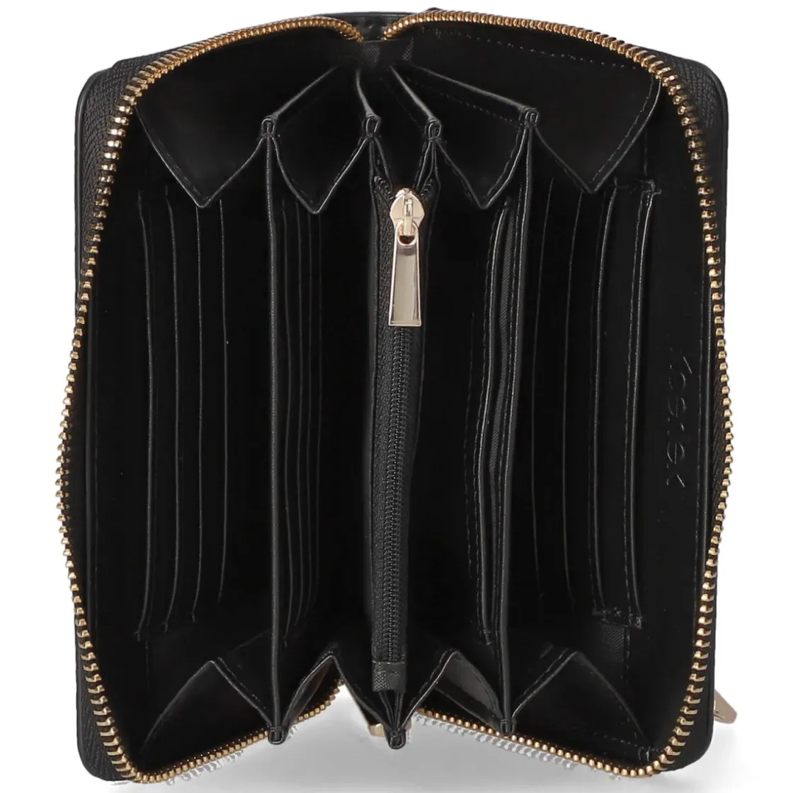 Diese Geldbörse für Damen vereint zeitlose Eleganz mit cleverer Organisation. Das schwarze Design wird von goldenen Akzenten und einem markanten Markenschriftzug veredelt, während der rundumlaufende Reißverschluss die Inhalte zuverlässig schützt. Mit kompakten Maßen von ca. 10 x 15 x 2,5 cm liegt das Modell gut in der Hand und passt bequem in Handtasche oder Clutch. Außen bietet ein praktisches Reißverschlussfach schnellen Zugriff auf Kleinigkeiten. Innen sorgen 12 Visitenkartenfächer, ein Steckplatz mit Sichtfenster für Ausweis oder Foto sowie ein separates Reißverschlussmünzfach für Ordnung und Überblick. Die fein abgestimmte Hardware hebt die klare Linienführung hervor und verleiht dezentes Glamour-Flair im Alltag. Modetipp: Zu einem monochromen Look in Schwarz oder Grau kombinieren und mit goldfarbenen Schmuckdetails den edlen Charakter der Börse stilvoll aufnehmen.
