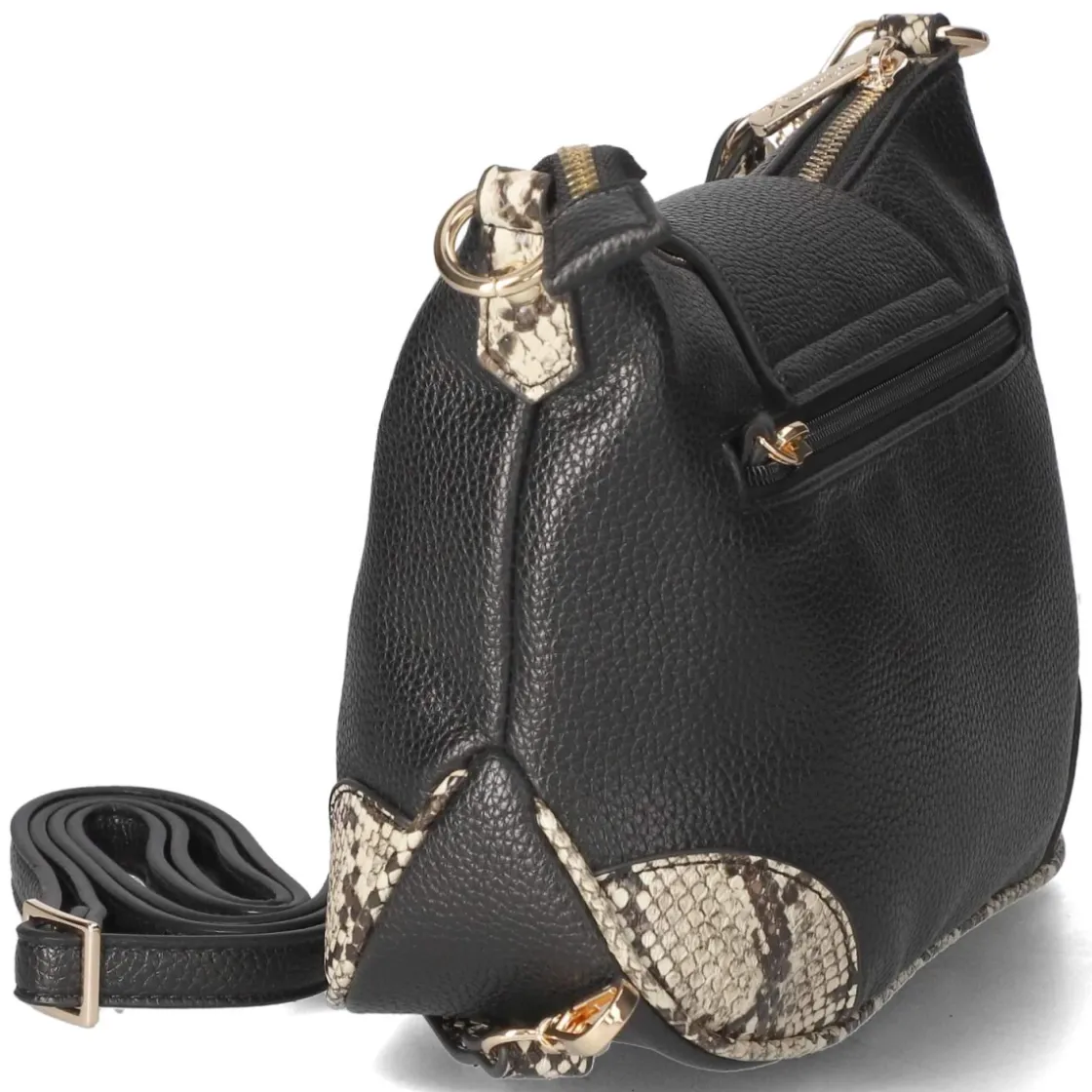 Diese schwarze Handtasche vereint klassische Linie mit modernem Akzent. Das kompakte Format von ca. 17 x 23 x 7 cm bietet bei rund 2,5 Litern Volumen erstaunlich viel Übersicht. Ein Reißverschlusshauptfach bewahrt Essentials sicher, innen strukturieren zwei Steckfächer und ein Reißverschlussfach den Alltag. Außen verleiht ein Überschlag mit elegantem Drehverschluss zusätzliche Sicherheit und eine edle Optik. Goldfarbene Akzente und Markenschriftzug setzen glanzvolle Highlights, während Partien im Reptilprint für subtilen Kontrast sorgen. Zwei abnehmbare Schulterriemen ermöglichen Wandelbarkeit: ein kürzerer von ca. 40 cm für die Schulter, ein längenverstellbarer bis ca. 110 cm für Crossbody-Komfort. Modetipp: Zu monochromen City-Looks mit Blazer und Slingbacks getragen, wirkt der Mix aus Schwarz und Reptilstruktur besonders raffiniert und verleiht minimalistischen Outfits Tiefe.