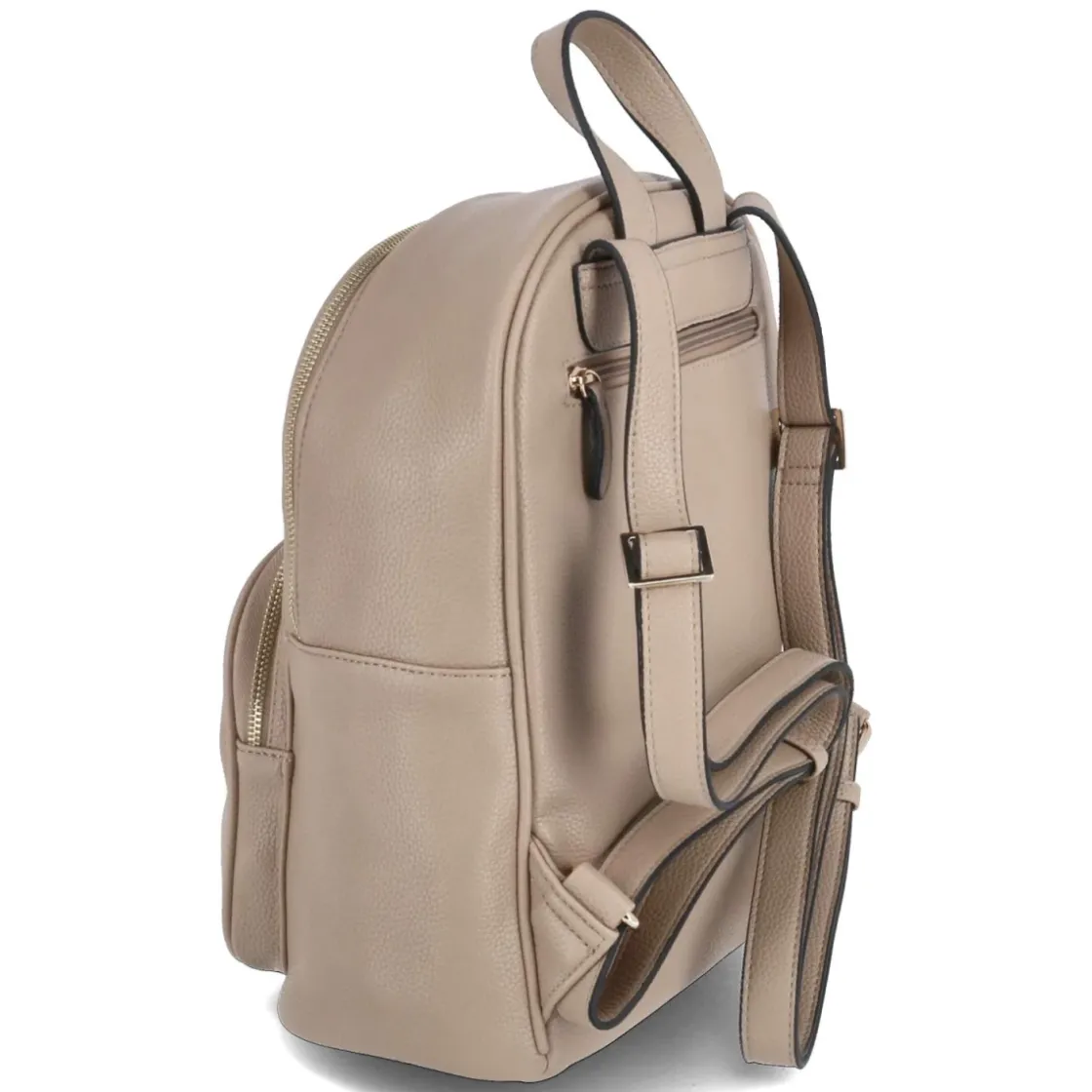 Der Damenrucksack in edlem Taupe kombiniert klare Linien mit durchdachter Funktion. Das Hauptfach wird sicher per Reißverschluss geschlossen und bietet bei kompakten Maßen von ca. 35 x 27 x 13 cm ein Volumen von etwa 10 Litern – ideal für Alltag und City. Außen sorgen vorne und hinten je ein Reißverschlussfach für schnellen Zugriff, innen strukturieren zwei Steckfächer und ein weiteres Reißverschlussfach wichtige Essentials. Ein verstärkter Boden verleiht Formstabilität und stellt den Rucksack zuverlässig ab. Verstellbare Tragegurte bis ca. 120 cm ermöglichen komfortables Tragen über Mantel oder Blazer. Die zurückhaltende Taupe-Nuance wirkt zeitlos und fügt sich mühelos in verschiedenste Looks ein. Modetipp: Für einen modernen Monochrom-Look mit sandfarbenem Trench, cremefarbener Bluse und hellen Loafern kombinieren – feiner Goldschmuck setzt elegante Akzente.