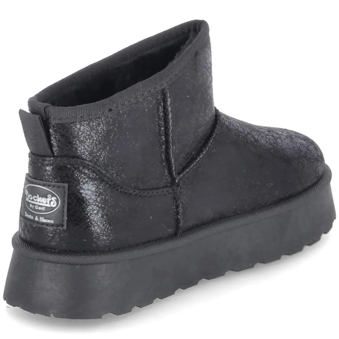 Die Dockers Boots für Kinder verbinden eine elegante Lackoptik mit durchdachtem Komfort für den Alltag. Das schwarze Obermaterial aus Textil glänzt stilvoll und wird von markanten, groben Nähten lässig akzentuiert. Innen sorgt warmes Futter mit weichem Kunstfell für ein behagliches Tragegefühl mit Wohlfühlfaktor, während die textile Decksohle angenehm am Fuß liegt. Die runde Schuhspitze bietet genügend Zehenfreiheit, der 3-cm-Plateauabsatz verleiht eine dezente Höhe und einen sicheren Stand. Ohne Verschluss gestaltet sich der Einstieg unkompliziert – ideal, wenn es morgens schnell gehen muss. Die Passform fällt normal aus und richtet sich gezielt an Kinder. Modetipp: Zu Strumpfhose und Cordrock entsteht ein smarter Look, mit schwarzer Skinny-Jeans und Pufferjacke wirkt das glänzende Finish besonders modern.