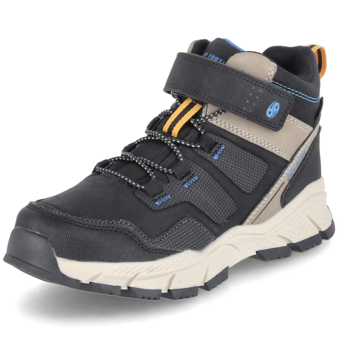 Der Outdoorboot von Dockers vereint kindgerechte Funktion mit einem sportlichen Design. Das robuste Obermaterial aus Textil und Synthetik hält durch die wasserfeste, wasserabweisende Ausrüstung zuverlässig trocken, während Warmfutter und isolierende Eigenschaften für angenehme Wärme sorgen. Die rund zulaufende Form bietet Zehenfreiheit, verstärkte Zehen- und Fersenbereiche erhöhen die Haltbarkeit. Dank Klettverschluss und Elastikband in Schnüroptik gelingt das An- und Ausziehen mühelos, der gepolsterte Einstieg sowie das weiche, textile Fußbett steigern den Tragekomfort. Die rutschhemmende Profilsohle greift sicher auf nassem Asphalt und matschigen Wegen. Atmungsaktivität unterstützt ein ausgeglichenes Fußklima, die Passform fällt normal aus. Modetipp: Mit dunkler Cargohose, warmem Parka und farblich passender Mütze entsteht ein lässiger Outdoor-Look für Schulweg und Spielplatz.