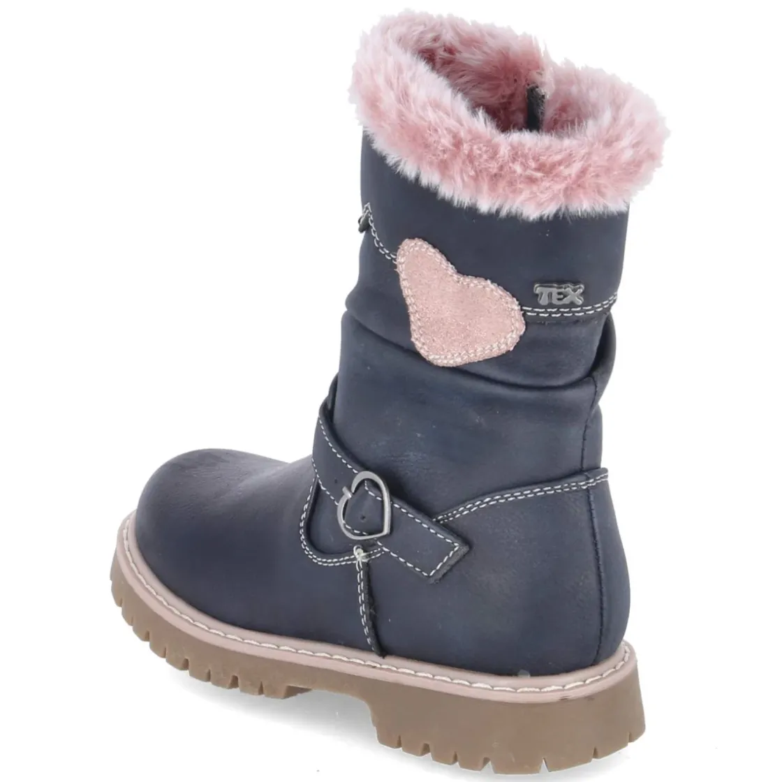 Der Kinderstiefel von Indigo in Dunkelblau verbindet Funktion und verspielte Details. Das Obermaterial aus Textil und Synthetik trotzt nassem Wetter, zugleich bleibt der Schuh atmungsaktiv – ideal für kühle Tage mit leichtem Futter. Der runde Leisten bietet Zehenfreiheit, das gepolsterte Fußbett erhöht den Tragekomfort im Alltag. Ein seitlicher Reißverschluss erleichtert das An- und Ausziehen, während der stabile 2,5‑cm‑Blockabsatz sicheren Stand gibt. Herzpatch in Rosa, eine passende Fellkrempe am Einstieg und ein zierender Knöchelriemen mit Herzschnalle setzen charmante Akzente. Die flexible, rutschhemmende Profilsohle sorgt für Halt auf verschiedenen Untergründen. Fällt normal aus und eignet sich für Kita, Spielplatz und Schulweg. Modetipp: Zu Jeans, Ringelshirt und Parka kombinieren, dazu farblich abgestimmte Mütze in Rosa für einen harmonischen Look.