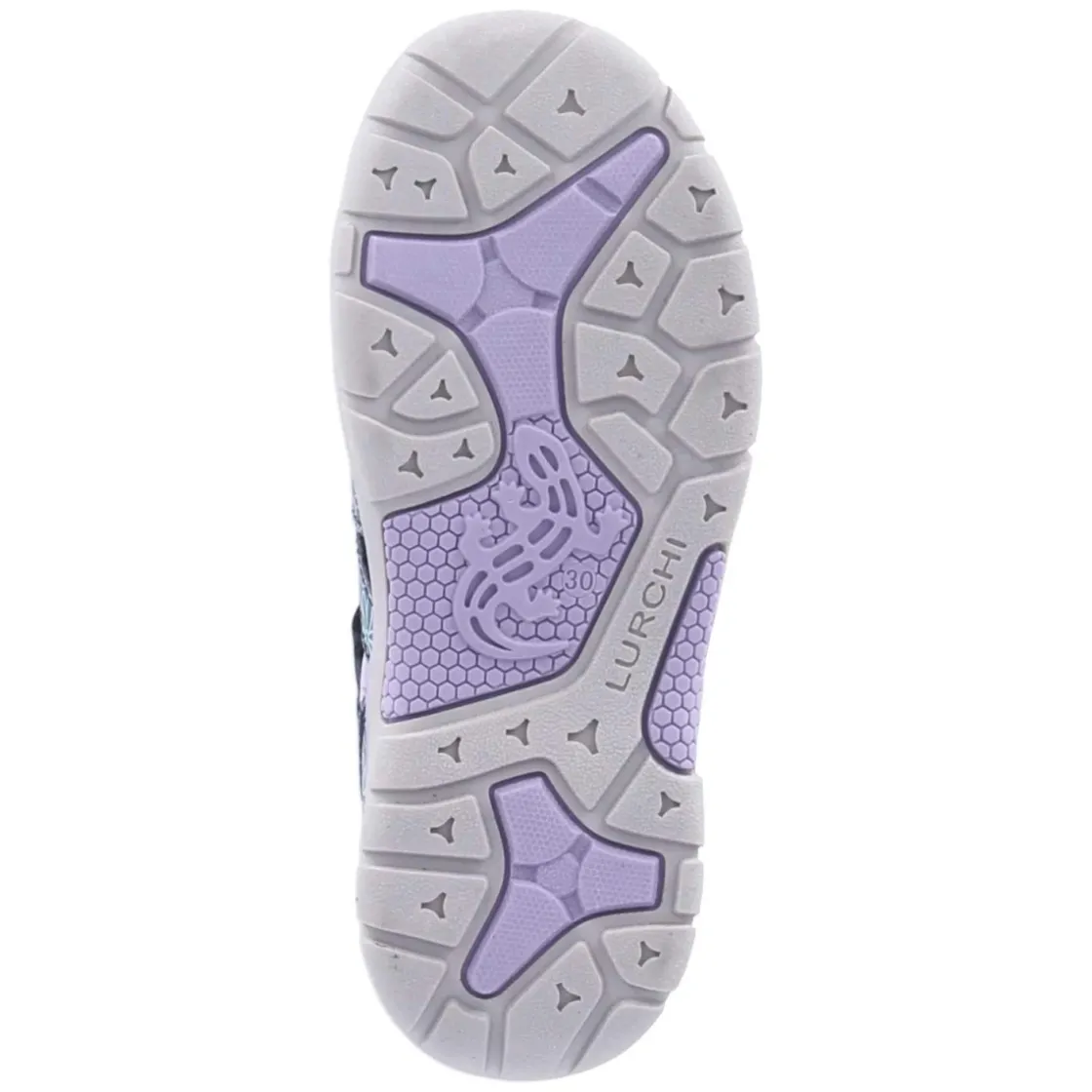 Die Lurchi Outdoorsandalen kombinieren kindgerechtes Design mit funktionalen Details für aktive Tage. Der moderne Material-Mix aus Textil und Synthetik zeigt sich in frischem Lila mit bedruckten Akzenten und einem seitlichen Blumenprint. Der runde, geschlossene Zehenbereich mit Schutzkappe bewahrt empfindliche Zehen beim Klettern und Toben. Ein weiches, herausnehmbares Synthetikfußbett bietet angenehmen Komfort und ermöglicht bei Bedarf den Einsatz eigener Einlagen. Dank bequemem Klettverschluss und zusätzlichem Elastikband in Schnüroptik gelingt das An- und Ausziehen schnell und sicher. Die flexible, rutschhemmende Profillaufsohle sorgt für verlässlichen Grip auf unterschiedlichen Untergründen, während der Schnitt normal ausfällt. Modetipp: Zu Shorts in Naturtönen und einem T-Shirt mit Blumenmotiv entsteht ein fröhlicher Outdoor-Look, der die Prints der Sandale stilvoll aufgreift.