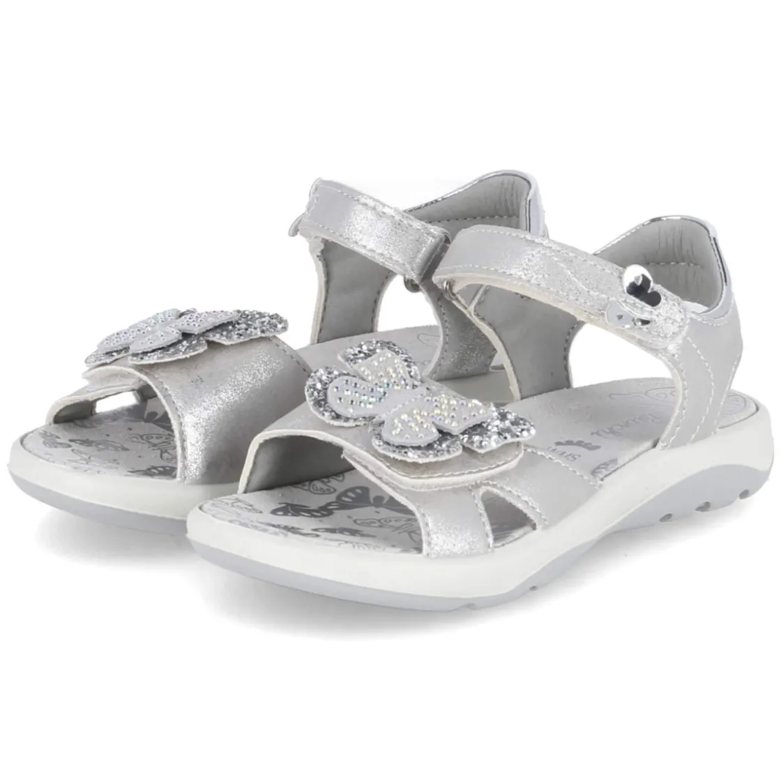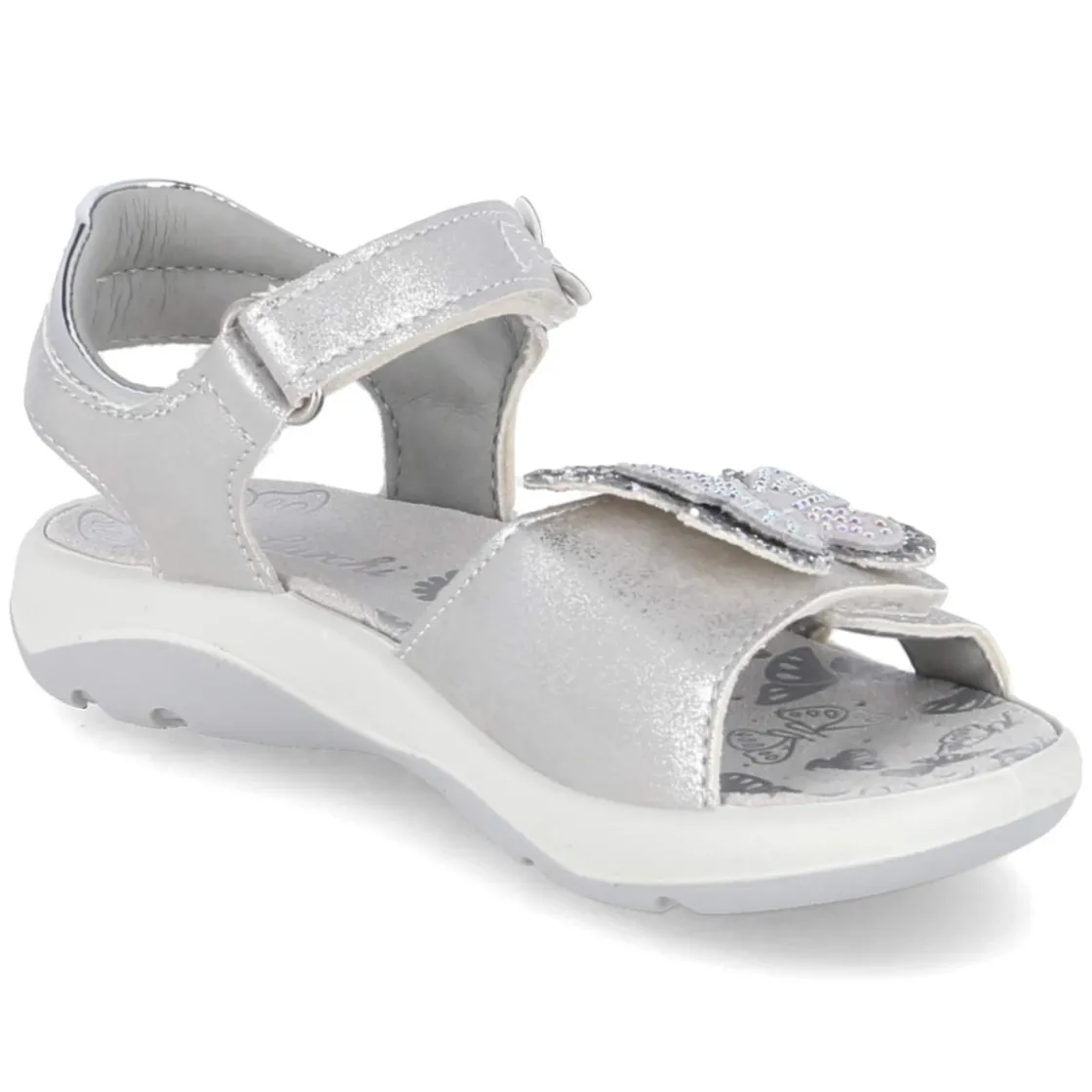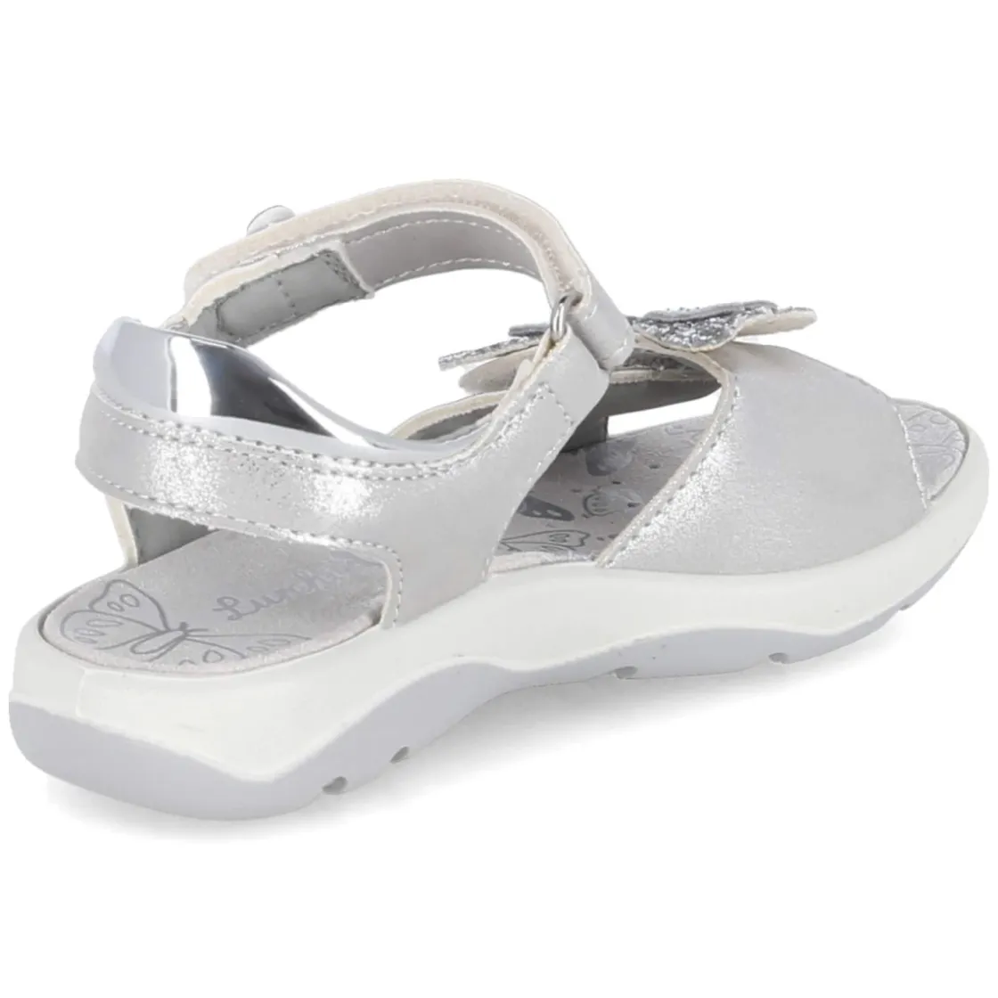Die Sandalen FARFALLA von Lurchi lassen kleine Füße in einem silbrigen Metallic-Glanz strahlen. Das synthetische Obermaterial unterstreicht die elegant schimmernde Oberfläche, während die offene Schuhspitze für luftigen Tragekomfort an warmen Tagen sorgt. Zwei praktische Klettverschlüsse erlauben eine passgenaue Weitenregulierung und erleichtern das An- und Ausziehen. Ein gepolsterter Fersenbereich und das weich gepolsterte, mit Leder bezogene Wechselfußbett verwöhnen empfindliche Kinderfüße den ganzen Tag. Für sicheren Halt sorgt die flexible, rutschhemmende Laufsohle, die auch auf glatten Böden Grip bietet. Funkelnde Glitzersteine auf der Schmetterlingsapplikation setzen einen verspielten Akzent, der sowohl zu festlichen Anlässen als auch im Alltag überzeugt. Der Schnitt fällt normal aus und bietet eine vertraute Größenauswahl. Modetipp: Zu einem pastellfarbenen Sommerkleid und einem leichten Jeansjäckchen kommt der metallische Schimmer besonders schön zur Geltung.