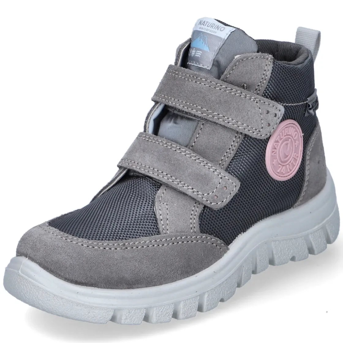 Klettstiefeletten GEMINAE von Naturino in Grau beweisen, wie funktional und lässig Kinderboots sein können. Das Obermaterial aus Textil und Synthetik ist atmungsaktiv und so verarbeitet, dass Nässe zuverlässig draußen bleibt; zugleich sorgen verstärkter Zehen- und Fersenbereich sowie die rutschhemmende, flexible Laufsohle für sicheren Halt auf dem Schulweg. Die runde Schuhspitze und der gepolsterte Einstieg garantieren bequemen Sitz, die zwei praktischen Klettverschlussriemen und die Anziehlasche erleichtern das An- und Ausziehen. Innen verwöhnt eine textile Decksohle, das gepolsterte, herausnehmbare Wechselfußbett unterstützt wachsende Füße und lässt sich bei Bedarf austauschen. Das Modell fällt normal aus und punktet mit dezenten rosa Akzenten. Modetipp: Zu Thermoleggings, Strickkleid und wattiertem Parka in Grau oder Rosé entsteht ein harmonischer Look.