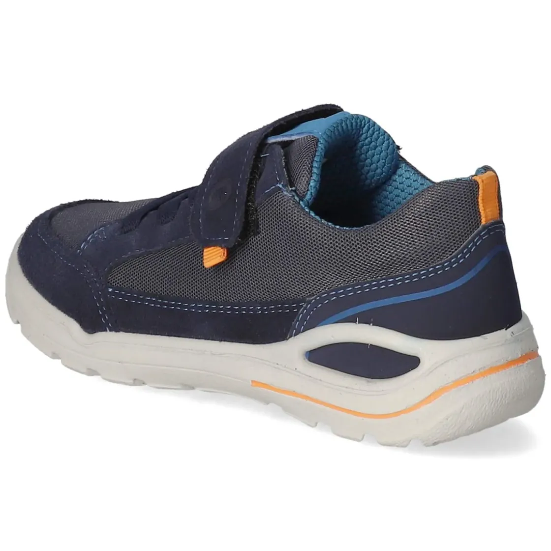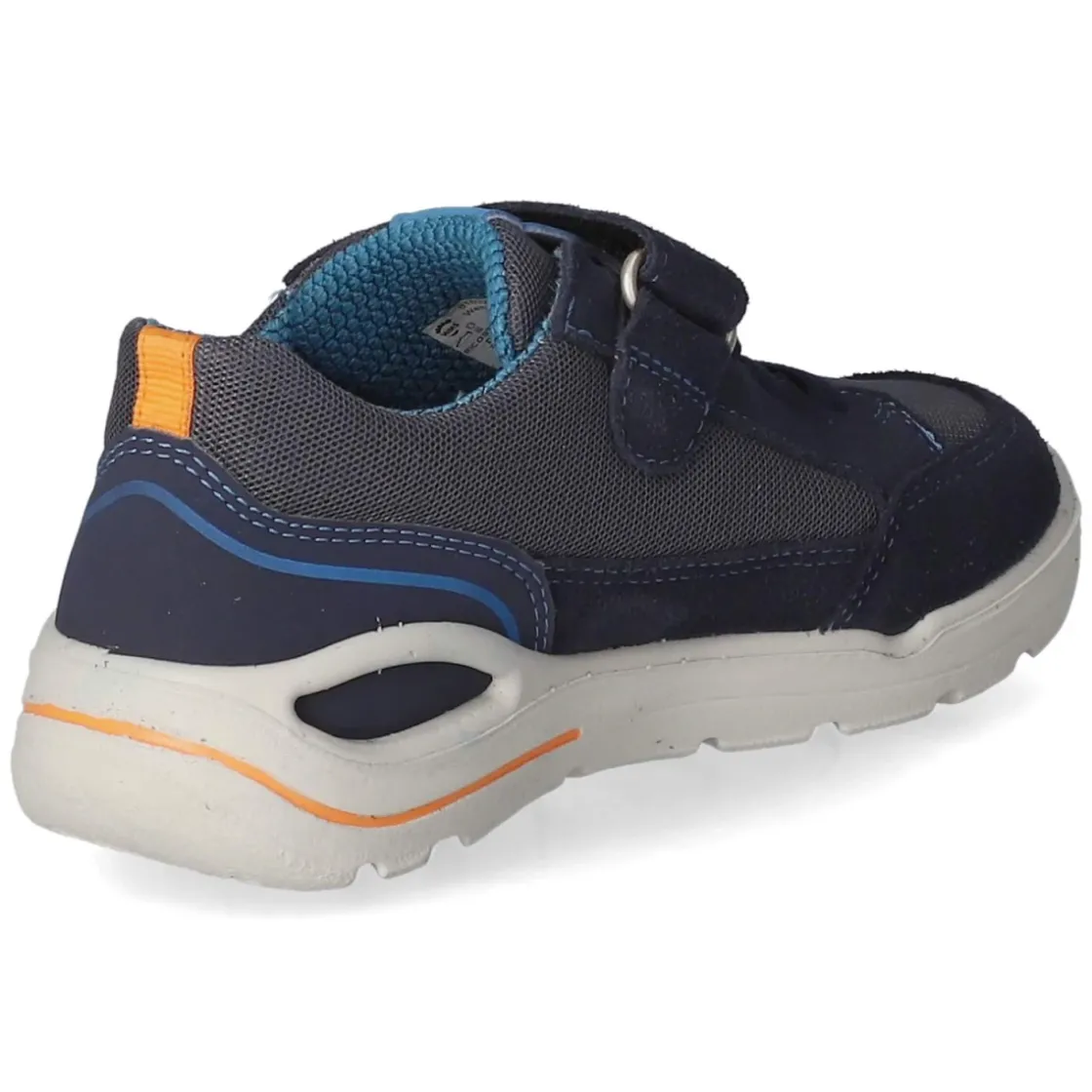 Der Low Sneaker EDDO von Ricosta bringt sportliche Lässigkeit in den Kinderalltag. Das Obermaterial aus Leder und Textil bildet einen robusten Material-Mix, der Toben im Hof ebenso mitmacht wie den Weg zur Schule. Blau mit orangefarbenen Akzenten und dezenten Markendetails wirkt der Sneaker frisch und vielseitig. Der runde Leisten mit Weite Mittel sitzt bequem und fällt größengetreu aus. Klettverschluss und Elastikband ermöglichen eigenständiges An- und Ausziehen und sichern einen flexiblen Halt, während der verstärkte Zehen- und Fersenbereich zusätzliche Stabilität gibt. Ein gepolsterter Einstieg schont empfindliche Füße, die gepolsterte, herausnehmbare Decksohle lässt sich bei Bedarf lüften oder gegen eigene Einlagen tauschen. Die flexible Laufsohle bietet gute Traktion auf unterschiedlichen Untergründen. Modetipp: Zu Denim, Sweatshorts oder farblich abgestimmten Jogpants entsteht ein dynamischer Freizeitlook.