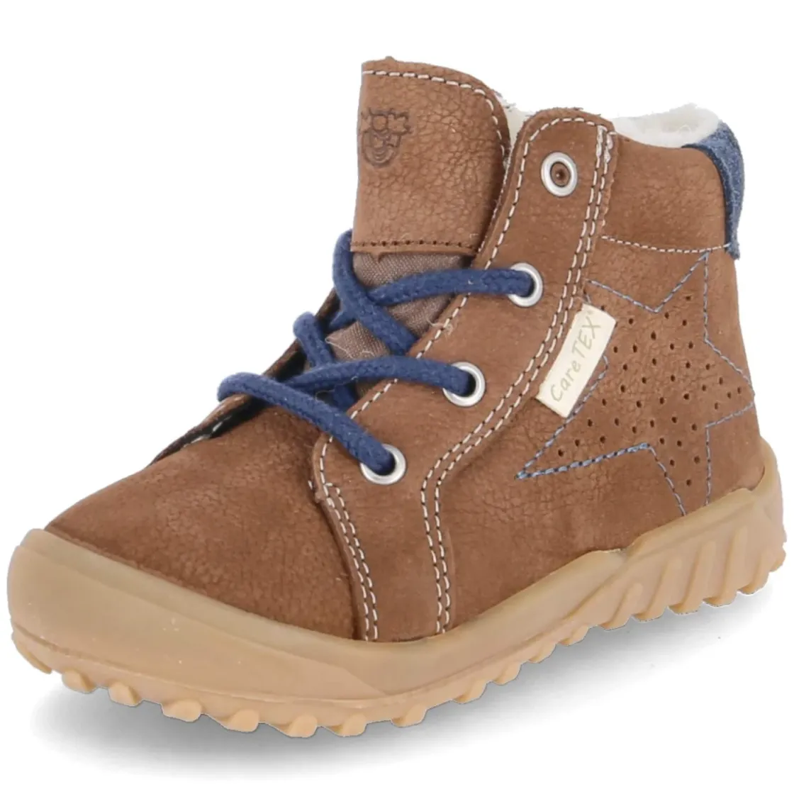Die Stiefeletten DENNY von Pepino verbinden kindgerechten Komfort mit robusten Eigenschaften für den Alltag. Das braune Rauleder unterstreicht den natürlichen Look, während blaue Schnürsenkel und ein seitlicher Stern einen fröhlichen Akzent setzen. Dank wasserabweisender, wasserfester und atmungsaktiver Ausstattung bleiben kleine Füße bei Nässe geschützt und fühlen sich dennoch angenehm an. Weiches Lammwollfutter wärmt zuverlässig, der gepolsterte Einstieg schont den Knöchel. Die runde Schuhspitze mit Zehenkappe bietet Extra-Schutz beim Spielen, die flexible, rutschhemmende Laufsohle sorgt für guten Grip. Mit herausnehmbarer Einlage und WMS-Schuhweite Weit ist genügend Platz vorhanden; der Schnitt fällt normal aus. Modetipp: besonders stimmig zu einer Cordlatzhose in Erdtönen und einer wetterfesten Jacke.
