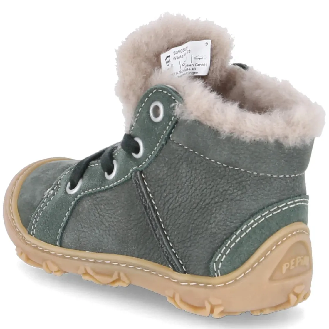 Die Stiefeletten ELIA von Pepino begleiten Kleinkinder zuverlässig durch kalte Tage. Das Obermaterial aus robustem Rauleder in frischem Grün trifft auf ein innen durchgehend verarbeitetes, weiches Lammfellfutter, das kleine Füße angenehm warm hält. Die runde Kappe und die verstärkte Ferse bieten Schutz und Stabilität, während die flexible, rutschhemmende Barefoot-Laufsohle ein natürliches Abrollen fördert. Dank Schnürsenkeln lässt sich der Sitz präzise anpassen; der gepolsterte Einstieg mit Fellkragen schmiegt sich sanft an. Ein Wechselfußbett und eine textile Decksohle erhöhen den Tragekomfort und erleichtern die Pflege. In WMS Weit gefertigt und größengetreu ausfallend, bleibt genug Platz für dicke Socken. Modetipp: Zu Wollmantel, Strickmütze und Cordhose entsteht ein fröhlicher Winterlook, der das Grün schön aufgreift.