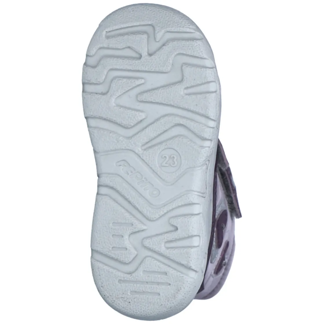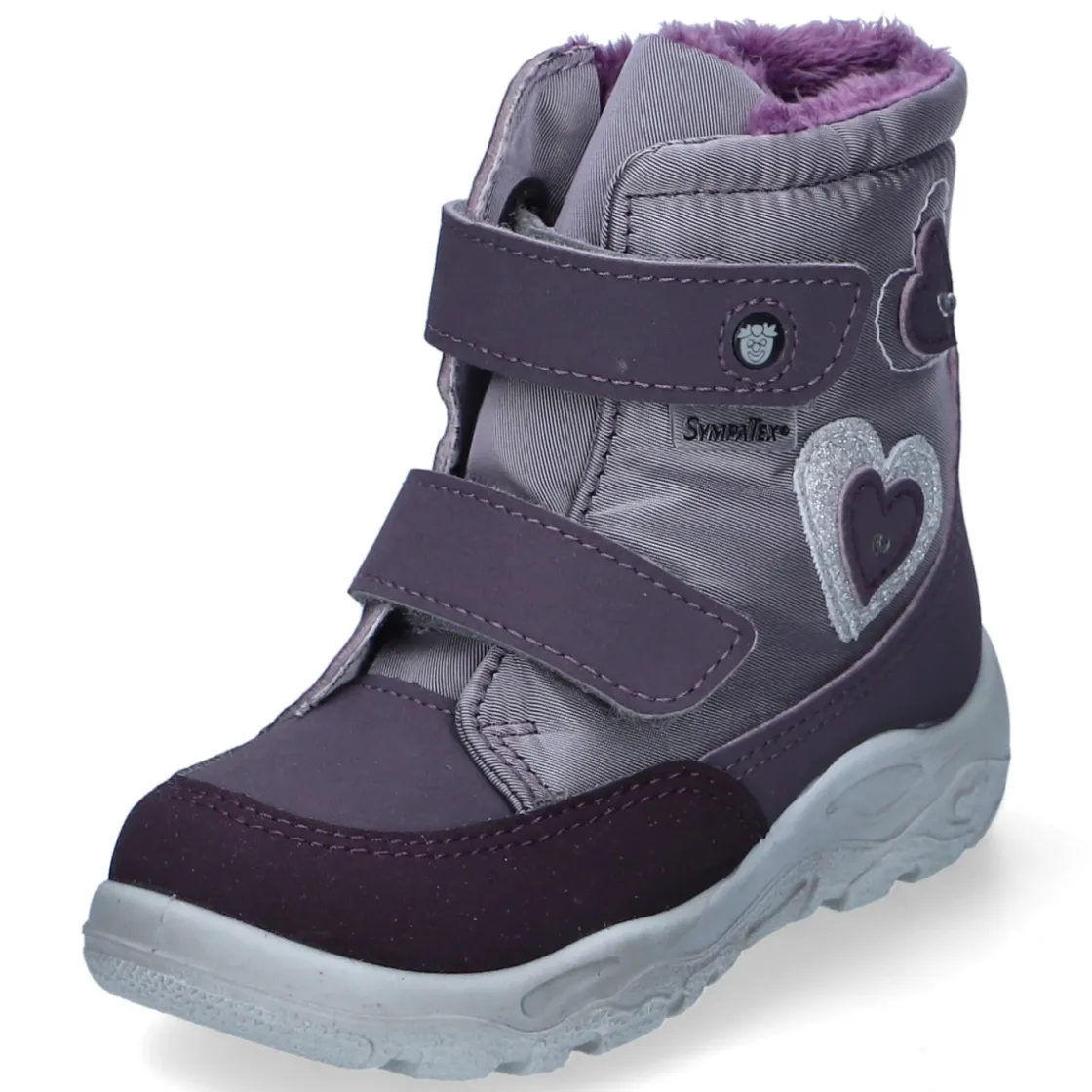 Die Winterstiefeletten MADDI von Pepino vereinen kindgerechten Komfort mit wetterfesten Eigenschaften. Das Obermaterial aus Textil und Synthetik zeigt sich in lebhaftem Lila, veredelt durch Herz-Applikationen, dekorative Nähte und silberne Highlights. Dank SympaTEX sind die Boots wasserdicht, winddicht und atmungsaktiv – ideal für wechselhaftes Winterwetter. Zwei praktische Klettverschlüsse erleichtern das An- und Ausziehen, die runde Spitze bietet viel Zehenfreiheit. Innen sorgt ein warmes, zugleich leichtes Futter mit Textildecksohle für behagliches Tragegefühl an kühlen Tagen. Eine flexible, rutschhemmende Laufsohle mit leichtem Profil unterstützt sicheren Halt auf nassem Asphalt und winterlichen Wegen. Blinkende LEDs setzen spielerische Akzente bei jedem Schritt. Der Schnitt fällt normal aus und passt so unkompliziert in den gewohnten Größenrahmen. Modetipp: Harmoniert toll zu einer beerenfarbenen Softshelljacke und dunkler Thermojeans mit reflektierenden Details.
