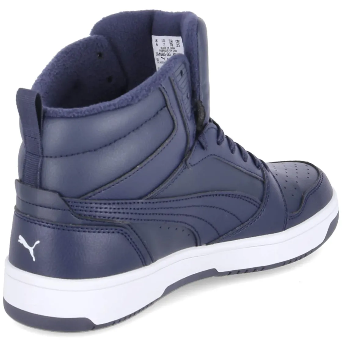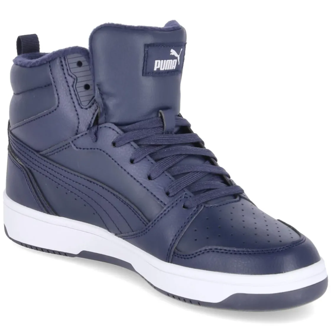 Der High Sneaker REBOUND V6 WTR JR von Puma vereint winterfesten Komfort mit sportlicher Street-DNA. Das blaue Obermaterial aus robustem Synthetik zeigt eine moderne Optik und lässt sich leicht reinigen, während perforierte Partien im Vorfuß und markante Branddetails den Basketball-Charakter aufnehmen. Die runde Spitze, eine zuverlässige Schnürung und die praktische Anziehlasche sorgen zusammen mit dem normal ausfallenden Leisten für unkompliziertes An- und Ausziehen. Innen hält ein wärmendes Textilfutter die Füße an kalten Tagen angenehm warm; die gepolsterte, herausnehmbare Decksohle steigert den Tragekomfort zusätzlich. Verstärkte Zonen an Zehen und Ferse erhöhen die Stabilität, ein weich gepolsterter Schaftrand schont den Knöchel. Die flexible, rutschhemmende Laufsohle mit leichtem Profil gibt sicheren Halt auf nassem Asphalt und glatten Wegen. Modetipp: Mit Straight-Jeans, gestepptem Puffer und Strickbeanie entsteht ein lässiger City-Winterlook.