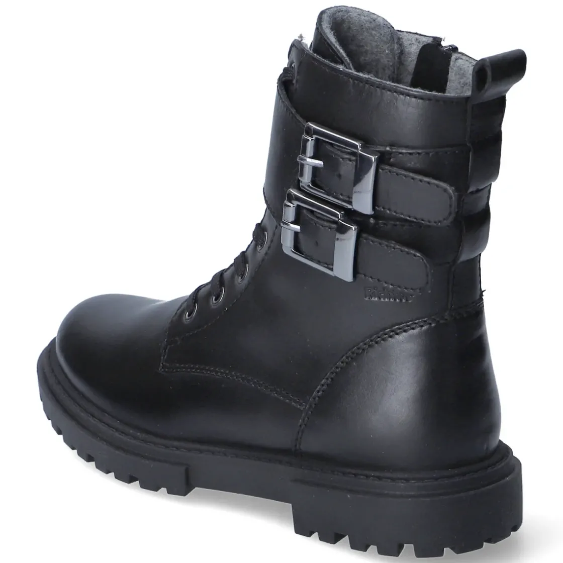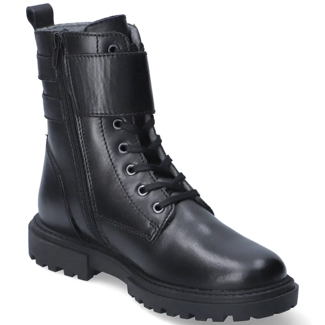 Schwarze Schnürstiefeletten von Richter, gefertigt aus langlebigem Echtleder mit markanten Ziernähten und dezenten Logos, verbinden urbanen Style mit Alltagstauglichkeit. Das warme, zugleich leichte Futter umschließt den Fuß angenehm, während die gepolsterte, textile Wechseldecksohle als komfortables Wechselfußbett zusätzlichen Komfort bringt. Schnürsenkel sorgen für präzise Anpassung, der bequemer Reißverschlußeinstieg ermöglicht schnelles An- und Ausziehen. Ein breiter Riemen mit zwei Schnallen setzt einen coolen Akzent, die Anziehlasche erleichtert das Handling. Runde Spitze, normal ausfallende Passform und eine stabile Laufsohle mit griffigem Profil plus Blockabsatz geben Halt auf kalten Wegen. Entwickelt für Jugendliche, die Wert auf Funktion und Stil legen. Modetipp: Zu schwarzer Skinny und Oversize-Parka kombinieren, dazu grob gestrickte Mütze – fertig ist der lässige Winter-Look.
