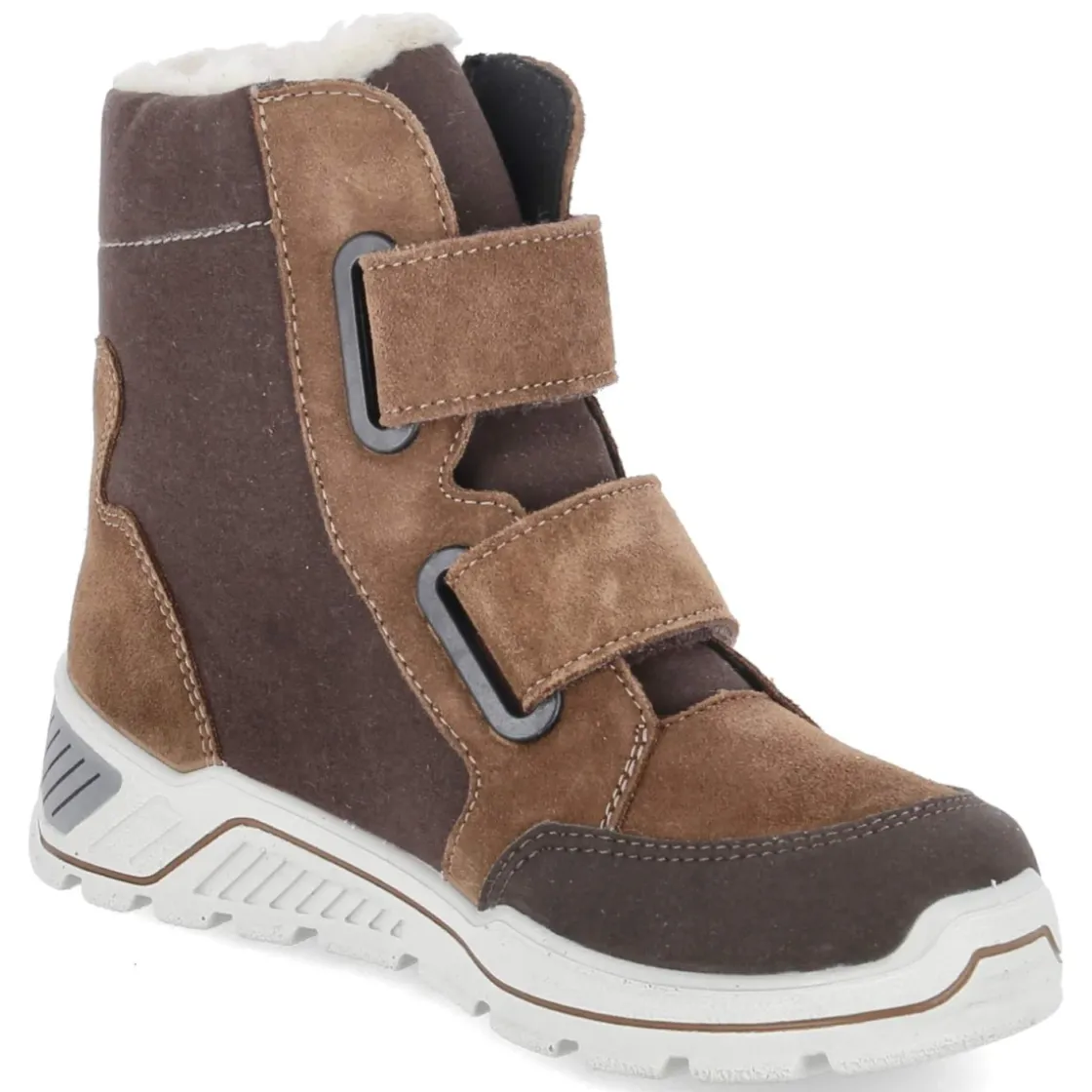 Die Snowboots JANEK von Ricosta verbinden funktionalen Wetterschutz mit sportlicher Optik und kindgerechtem Komfort. Das Obermaterial aus Leder und Synthetik ist robust verarbeitet, die Sympatex-Ausstattung hält zuverlässig wasserfest und unterstützt das atmungsaktive Klima im Schuh. Warmfutter in Teddy-Qualität sorgt für behagliche Wärme an kalten Tagen, während der gepolsterte Einstieg und die runde Schuhspitze angenehmen Tragekomfort bieten. Reflektierende Details erhöhen die Sichtbarkeit in der Dämmerung, die rutschfeste Profilsohle sichert Grip auf Schnee und Matsch. Der Klettverschluss ermöglicht ein schnelles An- und Ausziehen, das Wechselfußbett lässt sich zum Lüften oder für eigene Einlagen entnehmen. Verstärkte Zehen- und Fersenbereiche erhöhen die Langlebigkeit. Der braune Farbton passt vielseitig zu Wintergarderoben, die Passform fällt normal aus. Modetipp: Mit Steppjacke in Creme und einer Schneehose in Dunkelblau entsteht ein harmonischer, alltagstauglicher Look für den Schulweg.