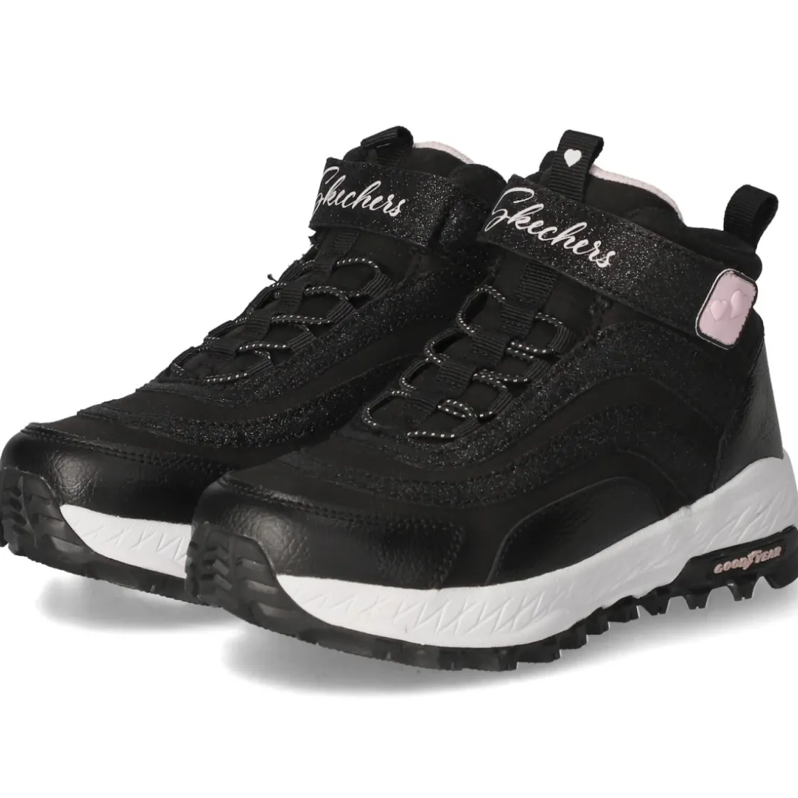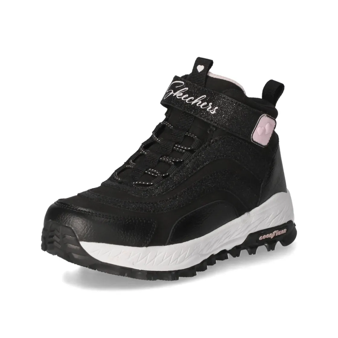 Der High Sneaker WILD ADVENTURE von Skechers vereint wetterfesten Schutz mit sportlichem Look. Das robuste Obermaterial aus Leder und Textil hält dank wasserfestem Finish und wasserabweisender Ausrüstung Regenschauer zuverlässig ab. Elastikschnürung und Klettverschluss erleichtern das Anziehen, die Anziehlasche unterstützt zusätzlich. Der gepolsterte Einstieg und die weich gepolsterte Textildecksohle sorgen für angenehmen Komfort, während verstärkter Zehen- und Fersenbereich den Schuh besonders kindgerecht und langlebig machen. Die flexible, profilierte Laufsohle bietet guten Grip auf nassem Asphalt wie auf dem Spielplatz. In Schwarz mit glitzernden Highlights und runder Kappe passt das sportliche Design zu vielen Outfits, der Fit fällt normal aus. Modetipp: Mit wetterfester Softshelljacke, Cargo-Jogger und reflektierender Mütze entsteht ein cooler Outdoor-Look für Schule und Abenteuer.
