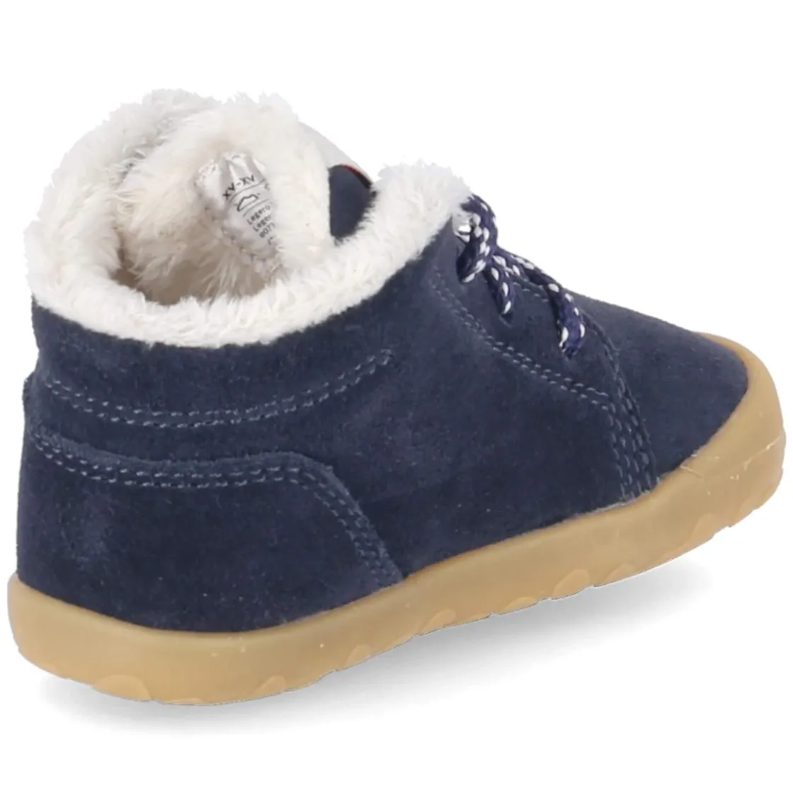 Die Lauflernschuhe FLUMMI von Superfit begleiten Kleinkinder bei den ersten Schritten mit einer gelungenen Mischung aus Geborgenheit und Bewegungsfreiheit. Weiches Rauleder in Blau und langlebiges Echtleder sorgen für eine wertige Haptik, während die textile Decksohle und das weiche Warmfutter einen behaglichen Wohlfühlfaktor schaffen. Die sehr flexible, rutschfeste Laufsohle mit hochgezogener Zehenkappe schützt kleine Zehen, die runde Schuhspitze bietet Platz für natürliche Abrollbewegungen. Dank Schnürsenkeln lässt sich der Sitz fein justieren, die verstärkte Ferse gibt Halt und wird durch ein seitlich gesticktes Bärenmotiv charmant akzentuiert. Der barefit-Leisten lässt Zehen Raum, der weiße Schuhkragen in Felloptik setzt einen winterlichen Kontrast. Fällt normal aus und passt so unkompliziert in den Alltag. Modetipp: Zu Strickleggings, Wollkleid oder Denim-Latzhose in Naturtönen entsteht ein stimmiger, cosy Look.