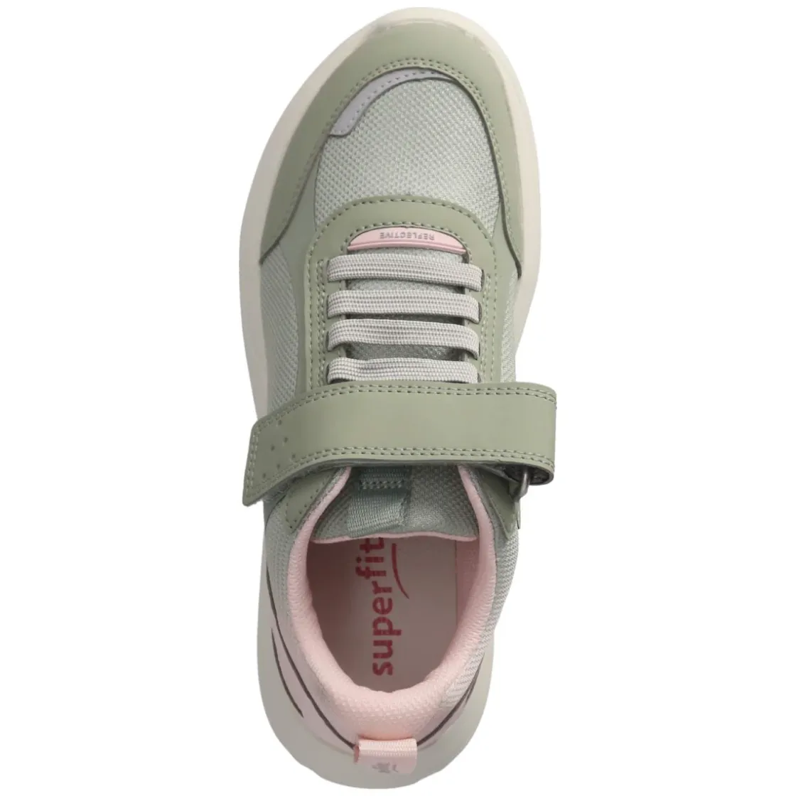 Der Low Sneaker RUSH von Superfit bringt frische Energie in den Kinderalltag: Das grüne Obermaterial aus Textil und Synthetik wird von rosafarbenen Akzenten belebt und durch reflektierende Details sicher in Szene gesetzt. Der robuste Material-Mix mit verstärktem Zehen- und Fersenbereich hält Abenteuern stand, während Mesh-Einsätze für Luftzirkulation sorgen. Ein gepolsterter Einstieg und ein herausnehmbares, weich gepolstertes Lederfußbett treffen auf eine flexible Laufsohle für natürlichen Abrollkomfort. Klettverschluss und Elastikband erleichtern das An- und Ausziehen, die Anziehlasche unterstützt zusätzlich. Die Passform fällt normal aus. Modetipp: Perfekt zu Denim-Shorts, gestreiftem T-Shirt und einer leichten College-Jacke – so wird der sportive Look komplett.