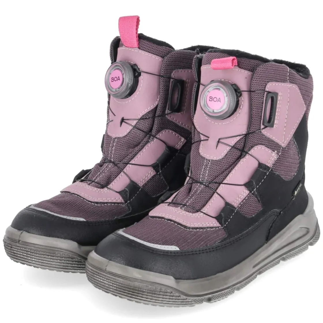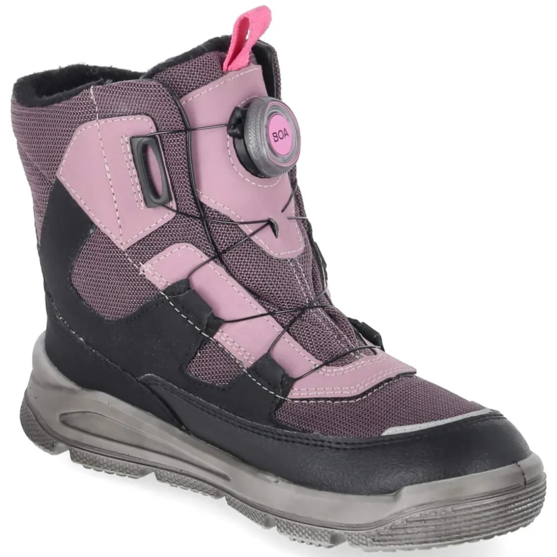Der Snowboot MARS von Superfit vereint wintertaugliche Funktion mit kindgerechtem Komfort. Das lila Obermaterial aus Textil und Synthetik bildet mit einem wasserfesten Material-Mix eine zuverlässige Barriere gegen Nässe, während Goretex im Zehenbereich zusätzlichen Schutz bietet. Warmfutter mit softem Teddygriff hält kleine Füße behaglich warm, der gepolsterte Schaft schont die Knöchel. Der runde Leisten gibt Zehenraum, ein verstärkter Fußrahmen stabilisiert den Auftritt. Mit dem BOA-Drehverschluss gelingt das An- und Ausziehen kinderleicht und sicher fixiert. Reflektierende Details an Zehenpartie und Anziehlasche erhöhen die Sichtbarkeit in der Dämmerung. Die textile Decksohle rundet das komfortable Fußklima ab. Der Schnitt fällt normal aus und ist damit unkompliziert zu wählen. Modetipp: Zu Ski- oder Softshellhose und gesteppter Parka in Grau oder Silber entsteht ein cooler Space-Look, den eine gemusterte Strickmütze harmonisch aufgreift.