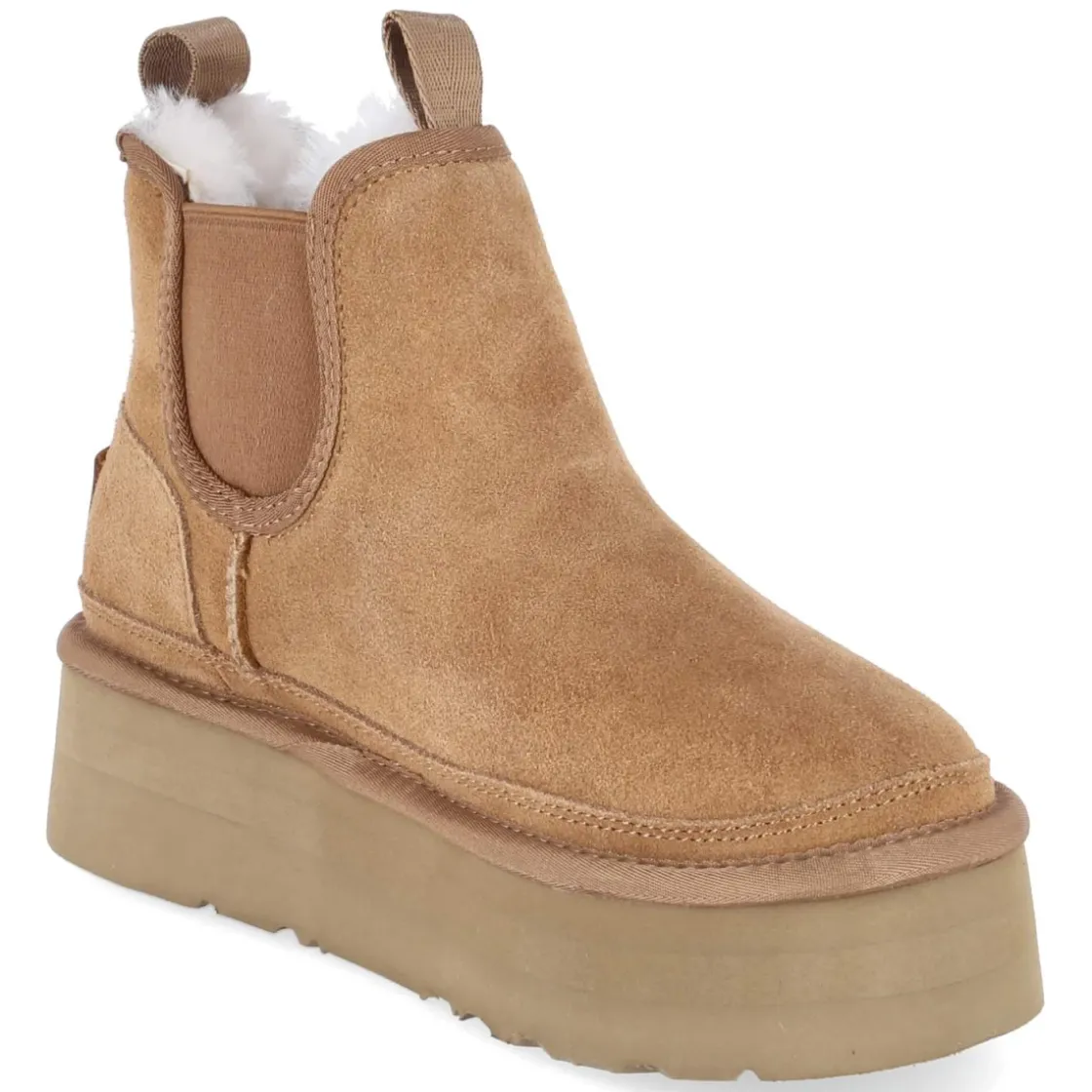 Chelsea Boots EDEN von Australia Luxe vereinen moderne Optik und Funktion. Das braune Rauleder aus robustem Echtleder zeigt markante Nähte und bekommt durch den schmalen Geröllschutzrand eine kernige Note. Zwei seitliche Elastikeinsätze und doppelte Anziehlaschen sorgen für einen unkomplizierten Einstieg, die verstärkte Ferse mit Metall-Label unterstreicht die hochwertige Verarbeitung. Innen wärmt dichtes Lammfellfutter, während die textile Decksohle angenehm soft auftritt. Die starke, zugleich leichte Plateausohle mit 5 cm Höhe streckt die Silhouette und bietet Grip im Alltag. Runde Spitze und normal ausfallende Passform geben zusätzlichen Komfort. Modetipp: Zu verkürzter Straight-Jeans, grobem Strick und einem langen Wollmantel in Camel wirkt das Modell besonders lässig.