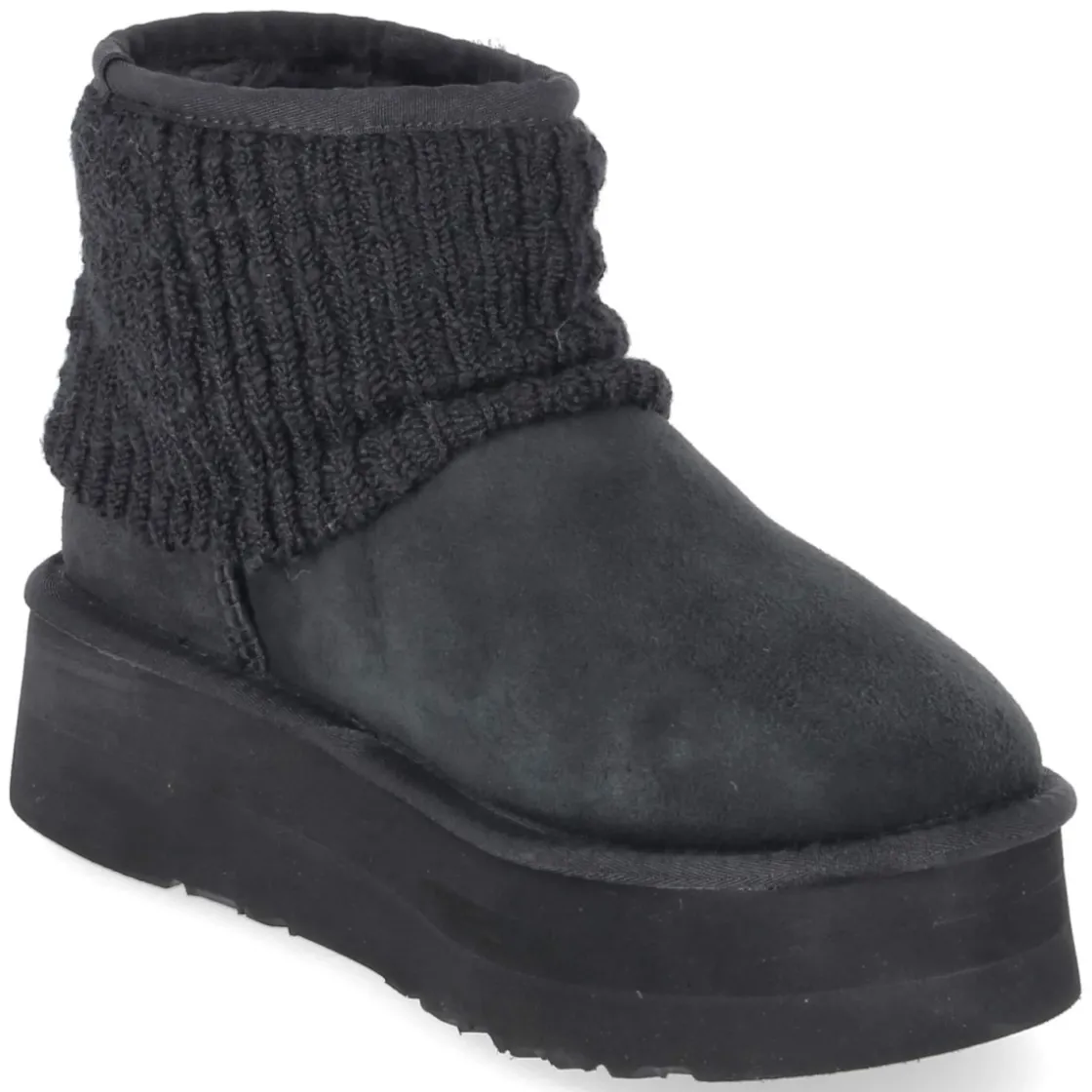 Winterboots FAME von Australia Luxe verbinden urbane Lässigkeit mit funktionalem Komfort. Der robuste Material-Mix aus Leder und Textil präsentiert sich in sattem Schwarz, betont durch markante Nähte. Ein warmes Lammfellfutter und die weiche Textildecksohle sorgen für ein behagliches Tragegefühl, während der gepolsterte Einstieg mit Umschlagkrempe und Lederpatch in Strickoptik sanft umschließt. Die starke, zugleich leichte Plateausohle mit 4,5 cm Absatzhöhe liefert Grip und moderne Proportionen; die runde Spitze und das Design ohne Verschluss machen den Einstieg unkompliziert. Eine verstärkte Ferse mit Metall-Label unterstreicht die hochwertige Verarbeitung. Fällt normal aus und bietet vielseitige Kombinationsmöglichkeiten vom City-Winter bis zum Wochenendtrip. Modetipp: Ton-in-Ton zu schwarzen Leggings, Oversize-Strick und einem langen Mantel tragen – so wirkt die Plateau-Form besonders elegant.