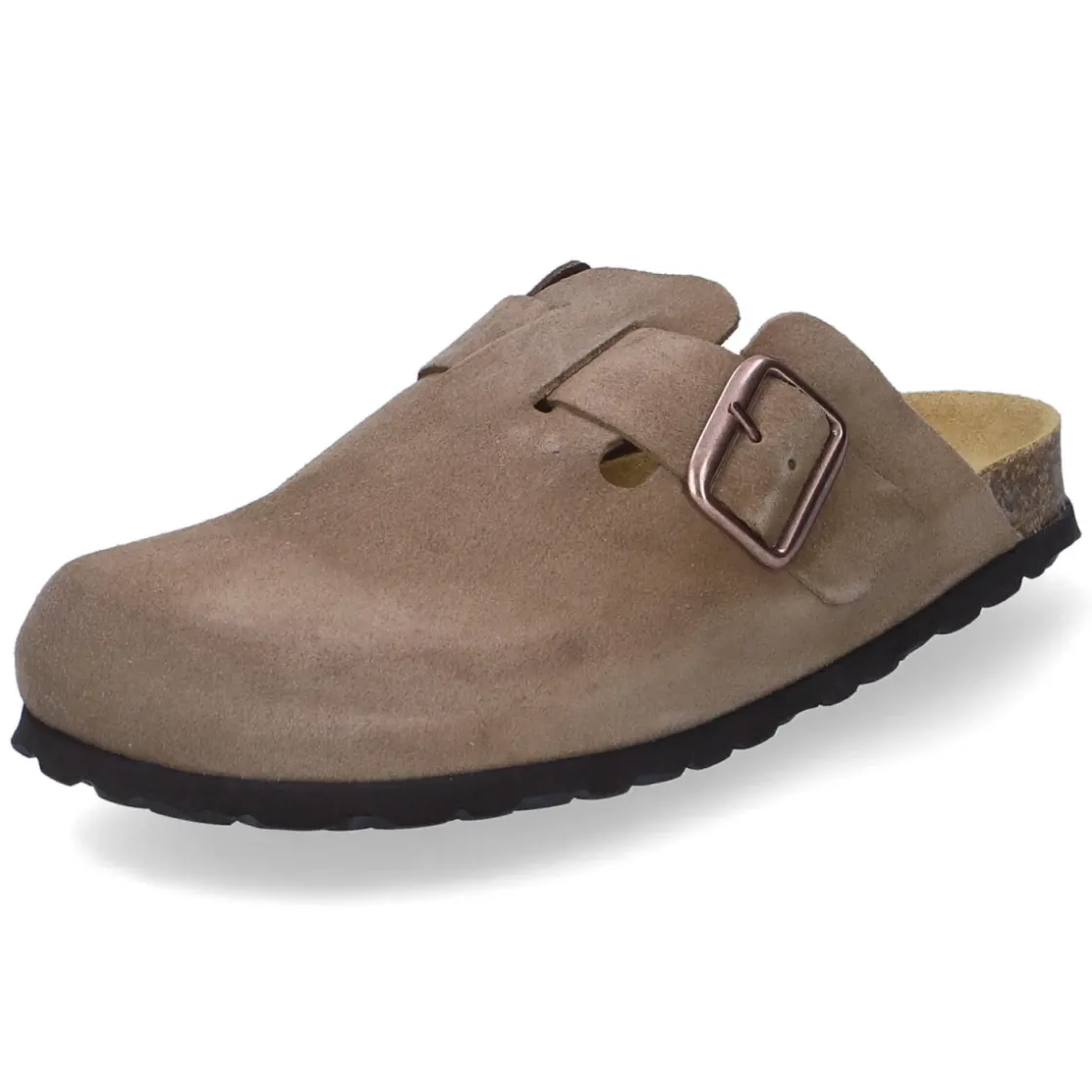 Beliana präsentiert Clogs für Damen, die Komfort und Charakter vereinen. Das Obermaterial aus hochwertigem Rauleder in warmem Braun zeigt einen natürlichen Look, während langlebiges Echtleder und die Lederdecksohle für wertige Haptik stehen. Ein gepolstertes, vorgeformtes Korkfußbett mit Lederbezug umschließt den Fuß angenehm, die runde Spitze gewährt Zehenfreiheit. Die flexible Profilsohle sorgt für Grip und das geringe Gewicht für ein leichtfüßiges Tragegefühl. Ein Riemen mit verstellbarer Schnalle in Kupferoptik erlaubt individuellen Halt, der Verschluss fügt sich stimmig in das Design. Größenhinweis: fällt größer aus; oftmals empfiehlt sich eine Nummer kleiner. Ein vielseitiger Begleiter vom Home-Office bis zur City. Modetipp: Mit Cropped-Jeans, feinen Rippstrümpfen und einem lockeren Strickcardigan entsteht ein lässiger, zeitloser Look in Naturtönen.