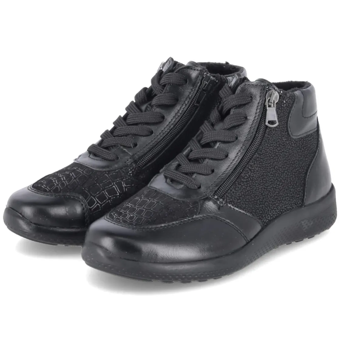 Die Schnürboots KIRA 24 von Beliana verbinden urbanes Design mit Alltagstauglichkeit. Der Material-Mix aus Leder und Textil zeigt sich in tiefem Schwarz, partiell mit feiner Reptilprägung, die dem robusten Look eine elegante Note verleiht. Runde Schuhspitzen und der gepolsterte Einstieg sorgen für angenehmen Platz und Komfort, während praktische Reißverschlüsse das An- und Ausziehen erleichtern. Ein leichtes Futter wärmt an kühlen Tagen, die flexible, rutschfeste Laufsohle gibt Halt auf wechselnden Untergründen. Verstärkte Zehen- und Fersenbereiche erhöhen die Langlebigkeit, das Wechselfußbett bietet Individualität beim Tragen. Mit normal ausfallender Passform ideal für den täglichen Einsatz in der Stadt. Modetipp: Zu cropped Straight-Jeans, Feinstrick und Wollmantel entsteht ein cleaner City-Look mit subtiler Edge.