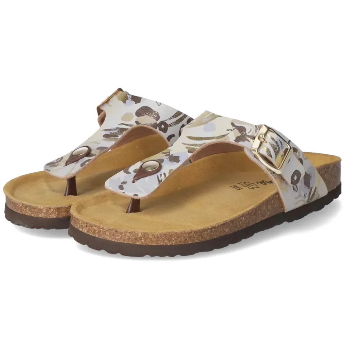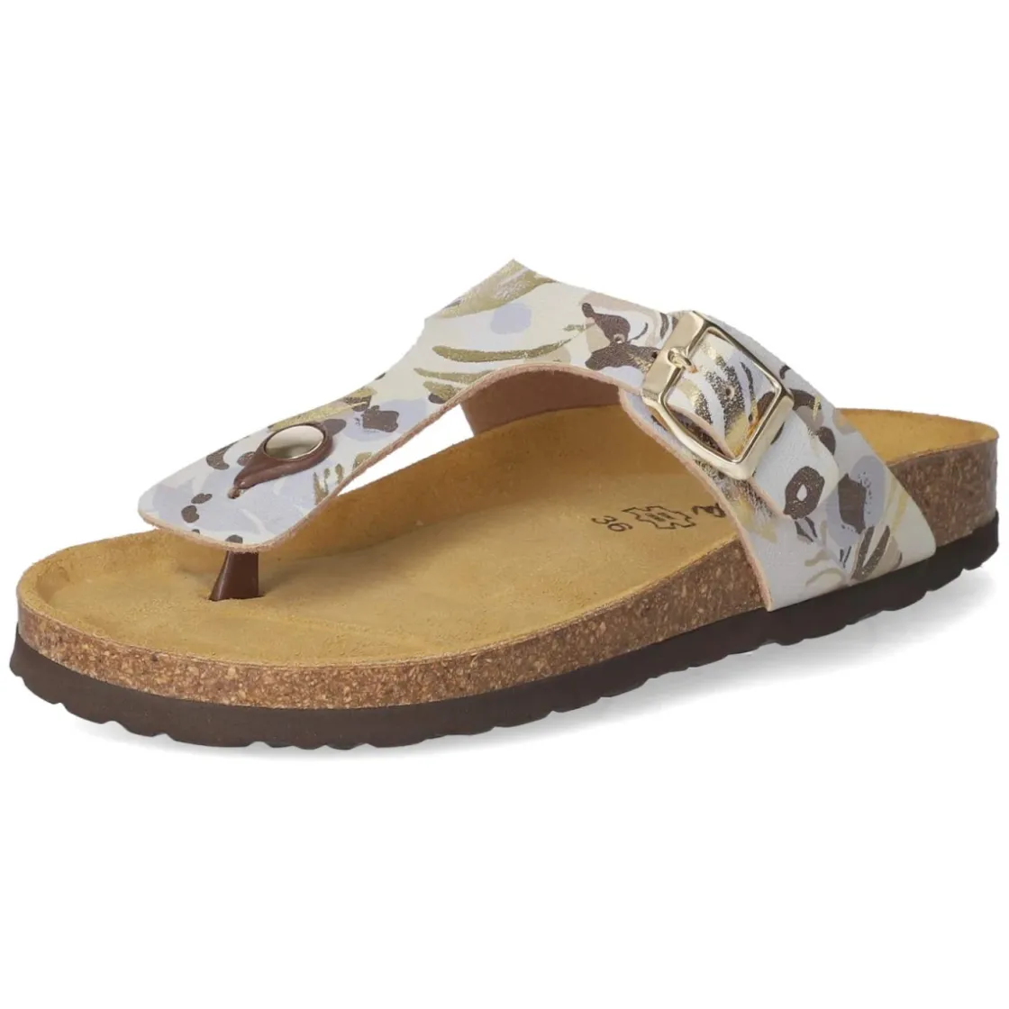Der gemusterte Zehentrenner von Beliana verbindet sommerliche Leichtigkeit mit komfortabler Ausstattung. Die abstrakte, mehrfarbige Musterung setzt einen lebhaften Akzent, während die goldene Schnalle einen eleganten Glanzpunkt bildet. Das Obermaterial aus Kunstleder überzeugt mit pflegeleichter Oberfläche, die sich unkompliziert reinigen lässt. Für langanhaltenden Komfort sorgt die vorgeformte, gepolsterte Lederdecksohle, die gemeinsam mit der flexiblen Laufsohle ein angenehm weiches Auftreten ermöglicht. Der offene Schnitt und der unkomplizierte Einstieg unterstreichen die entspannte Note, der verstellbare Verschluss bietet dabei zuverlässigen Halt. Die Passform fällt normal aus und eignet sich für den täglichen Einsatz in der warmen Saison. Modetipp: Zur Betonung des Farbspiels harmonieren luftige Leinenhosen und ein unifarbenes Top; goldfarbener Schmuck greift die Schnalle stilvoll auf.