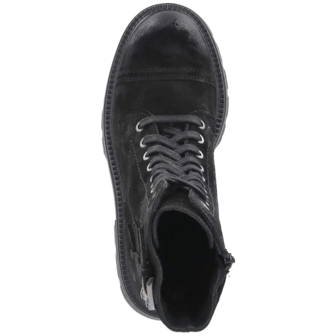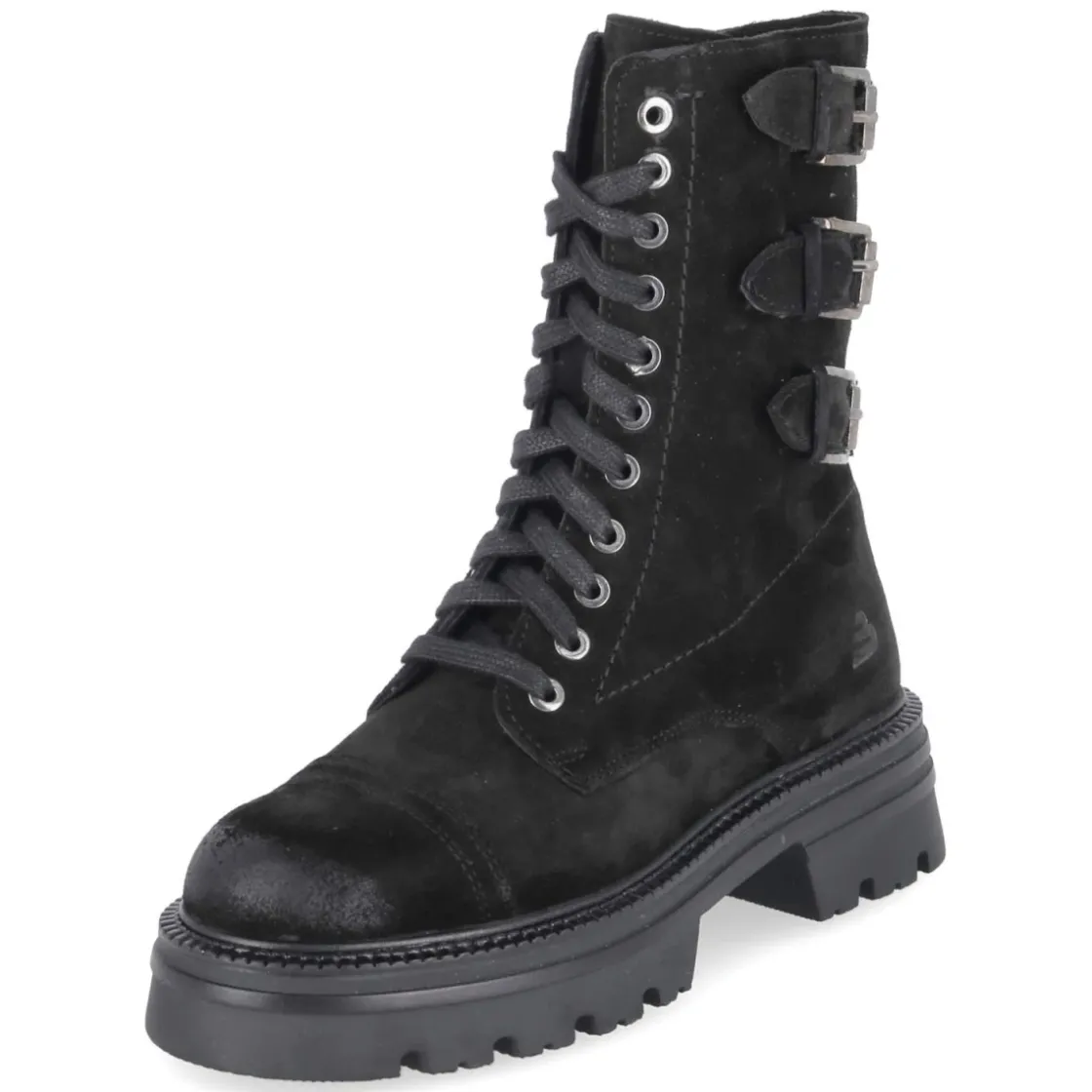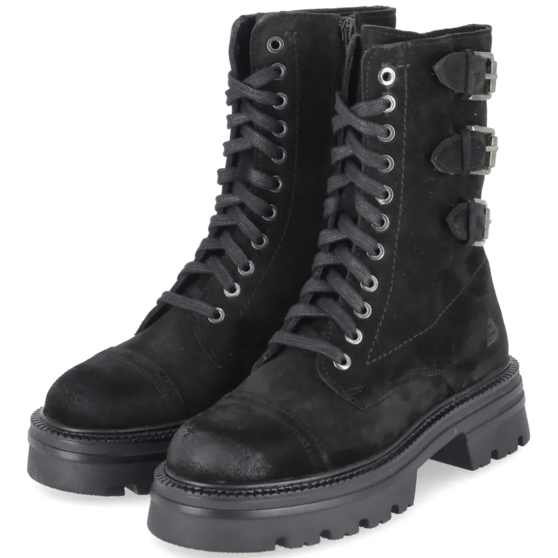 Die Bullboxer Biker Boots bringen lässigen Used-Look und durchdachten Komfort zusammen. Rauleder aus langlebigem Echtleder bildet die markante Basis, Ziernähte und Toe Cap unterstreichen den robusten Charakter. Drei Riemen mit Schnalle am hinteren Schaft setzen einen rockigen Akzent. Der 5 cm hohe Blockabsatz harmoniert mit der rutschfesten Profilsohle für stabilen Halt auf urbanem Terrain. Schnürsenkel sorgen für individuelle Anpassung, der zusätzliche Reißverschluss erleichtert den Einstieg. Ein gepolstertes Fußbett unterstützt angenehm durch längere Tage, die runde Schuhspitze gewährt Zehenfreiheit. Fällt normal aus und passt zu vielseitigen City-Looks. Modetipp: Mit schwarzer Skinny-Jeans, Oversize-Blazer und Leder-Accessoires entsteht ein moderner Mix aus Eleganz und Biker-Attitüde.