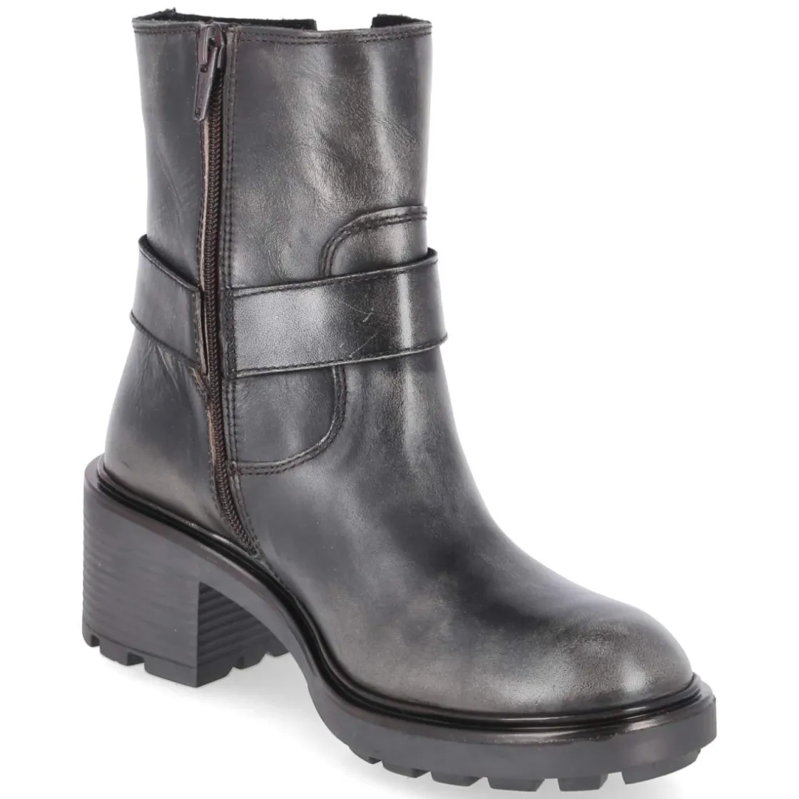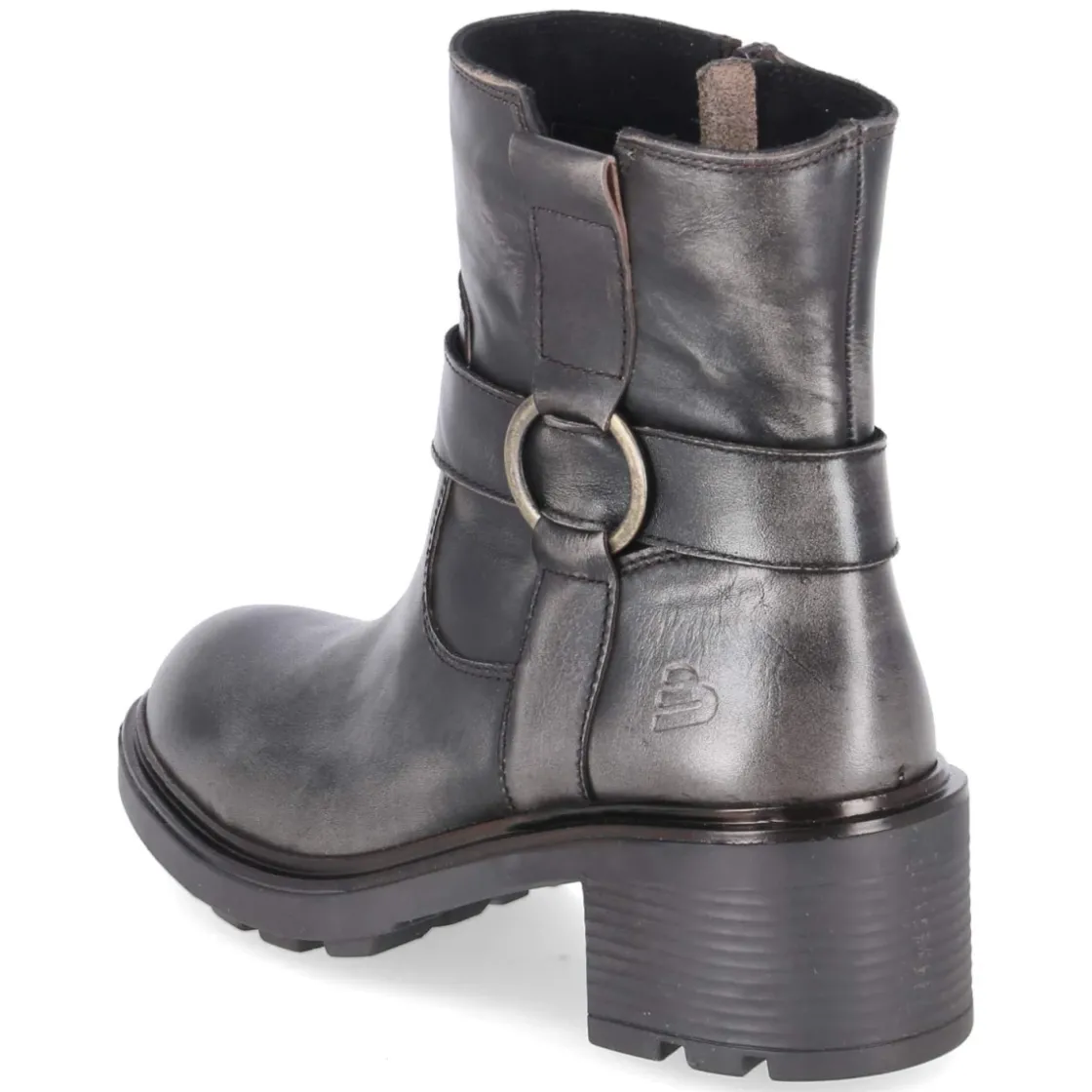 Bullboxer interpretiert den klassischen Biker-Look mit robusten Boots aus langlebigem Glattleder in Braun, das je nach Licht dezent grau wirken kann. Die markante Ringschnalle am Schaft betont die kraftvolle Silhouette, während die rutschfeste Profilsohle und der 6 cm hohe Blockabsatz sicheren Stand auf urbanem Terrain bieten. Ein gepolstertes Fußbett und eine synthetische Decksohle sorgen für Komfort im Alltag. Der schmale Schnitt und die runde Kappe verleihen dem Modell eine feminine Linie, der seitliche Reißverschluss ermöglicht einen bequemen Einstieg. Die solide Verarbeitung und die kräftige Sohle machen die Stiefelette zum beständigen Begleiter von Früh bis Spät. Modetipp: Für einen stilvollen Kontrast zu der derben Form eignen sich fließende Midikleider und Feinstrick, ergänzt um eine Lederjacke in Ton-in-Ton-Optik.
