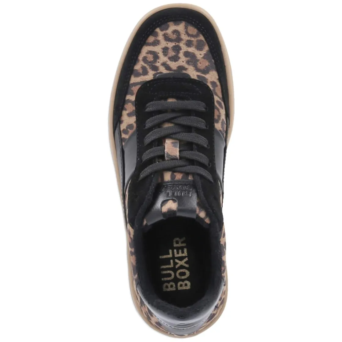 Der Low Sneaker von Bullboxer setzt auf einen stilvollen Ledermix und einen markanten Animal Print im Leopard-Design, der dem schwarzen Look einen raffinierten Akzent verleiht. Das Obermaterial aus Leder trifft auf glänzende Lackelemente, während die runde Kappe mit gelochtem Zehenbereich für Luftzirkulation sorgt. Eine verstärkte Zehen- und Fersenpartie schafft Halt, der gepolsterte Einstieg erhöht den Wohlfühlfaktor. Das gepolsterte, herausnehmbare Wechselfußbett mit synthetischer Decksohle unterstützt komfortables Gehen, die flexible, rutschhemmende Cupsohle bietet zuverlässige Traktion im Alltag. Handcrafted-Details und dezente Label-Elemente setzen hochwertige Nuancen. Dank klassischer Schnürung lässt sich die Passform fein justieren, der Größenhinweis fällt normal aus. Modetipp: Besonders wirkungsvoll zu Cropped-Jeans und Lederjacke oder als Kontrast zum eleganten Satin-Midirock.