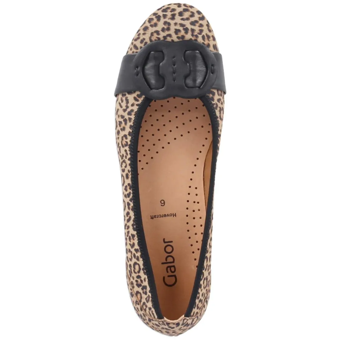 Gabor interpretiert den klassischen Ballerina mit einer eleganten, beigen Basis und markantem Animal Print in Leopard-Optik neu. Weiches Rauleder schmiegt sich an den Fuß, die runde Spitze unterstreicht die feminine Linie. Der schwarze Zierriemen mit Dekoschnalle setzt einen stilvollen Kontrast. Innen sorgt atmungsaktives Echtleder mit gepolstertem Hovercraft-Lederfußbett für spürbare Dämpfung und ein angenehmes Klima, während eine verstärkte Ferse Stabilität verleiht. Die flexible, rutschhemmende Laufsohle bietet zuverlässigen Halt im Alltag. Ohne Verschluss gestaltet, fällt das Modell normal aus und ist unkompliziert zu tragen – vom Büro bis zum Dinner. Modetipp: Besonders harmonisch zu Naturtönen wie Ecru und Sand, etwa mit Midirock und feiner Strickjacke; als Statement gelingt der Look mit schwarzer Zigarettenhose und goldfarbenen Accessoires.