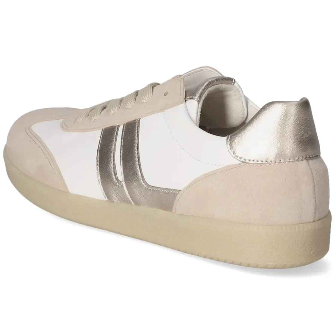 Dieser Low Sneaker von Gabor verbindet dezente Eleganz mit Alltagstauglichkeit. Das Obermaterial aus robustem Echtleder zeigt sich in strahlendem Weiß, akzentuiert von goldfarbenen Details und beigefarbenen Rauleder-Elementen. Eine runde Schuhspitze und ein leicht gepolsterter, bequem geformter Einstieg sorgen zusammen mit der klassischen Schnürung für eine angenehme Passform und individuelle Anpassung; die Weite fällt normal aus. Zehen- und Fersenbereich sind verstärkt, was Formstabilität und Langlebigkeit erhöht. Innen bietet eine Lederdecksohle zusammen mit einer gepolsterten, herausnehmbaren Wechseldecksohle langanhaltenden Komfort; das Wechselfußbett lässt sich bei Bedarf einfach austauschen. Die flexible, rutschhemmende Laufsohle gibt sicheren Halt im Alltag. Modetipp: Zu Cropped-Jeans, weißem T-Shirt und beigem Trench entsteht ein cleaner City-Look, den zarter Goldschmuck stimmig abrundet.