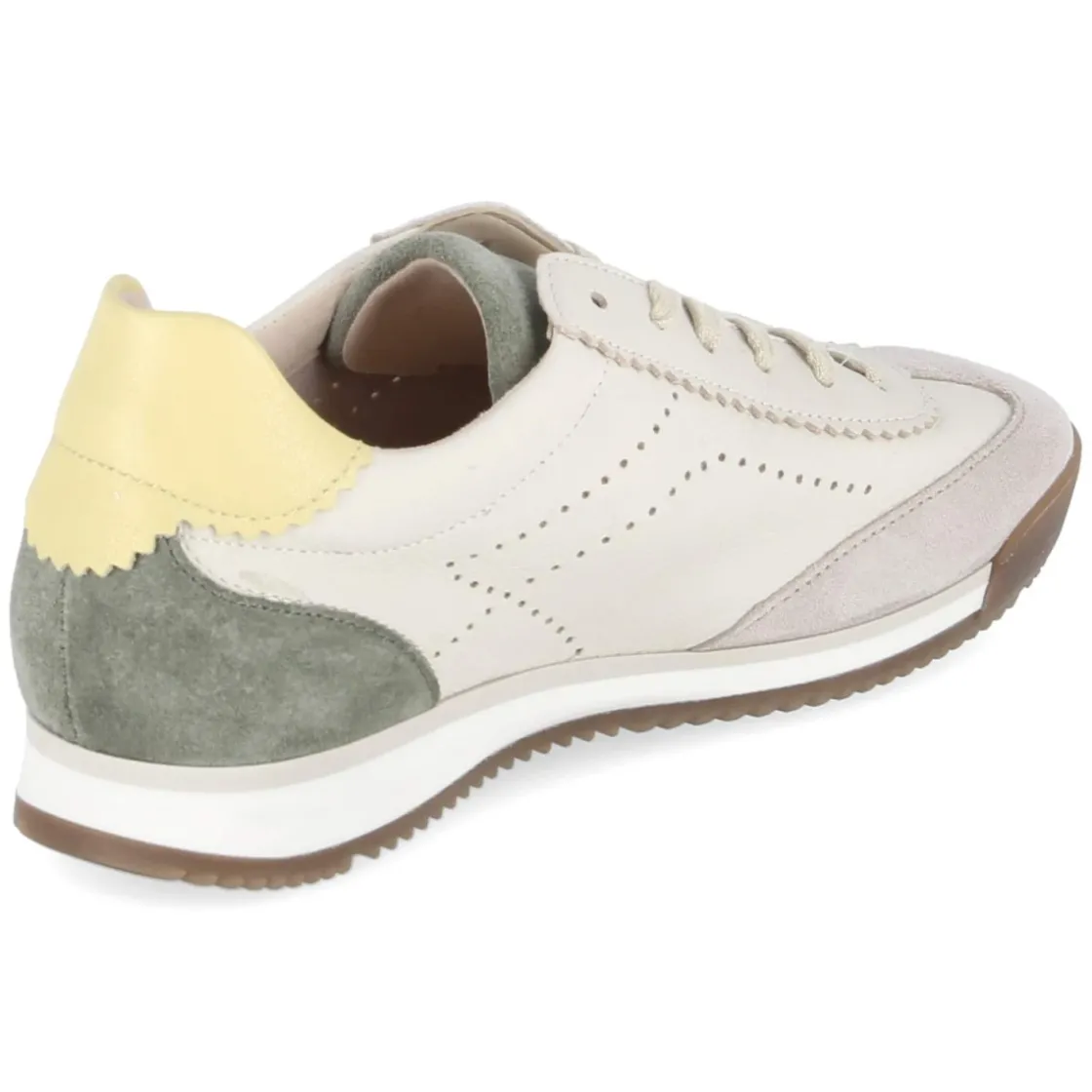 Der Low Sneaker von Gabor in Beige überzeugt mit hochwertigem Glattleder und einer klaren, runden Silhouette. Grüne und gelbe Pastell-Elemente setzen frische Akzente, während die seitliche Lochstanzung für angenehme Luftzirkulation sorgt. Die Schnürung ermöglicht eine präzise Anpassung, das Wechselfußbett und die hautfreundliche Lederdecksohle steigern den Tragekomfort im Alltag. Eine flexible Laufsohle mit Grip unterstützt sicheren Halt, verstärkter Fersen- und Zehenbereich sowie ein leicht gepolsterter Einstieg erhöhen die Langlebigkeit und Bequemlichkeit. Der Sneaker fällt normal aus und bietet beste Kombinationsmöglichkeiten von Denim bis Midikleid. Modetipp: Beige zu Offwhite und einem pastellgrünen Cardigan stylen und mit zarten Gold-Accessoires die Farbakzente elegant aufnehmen.