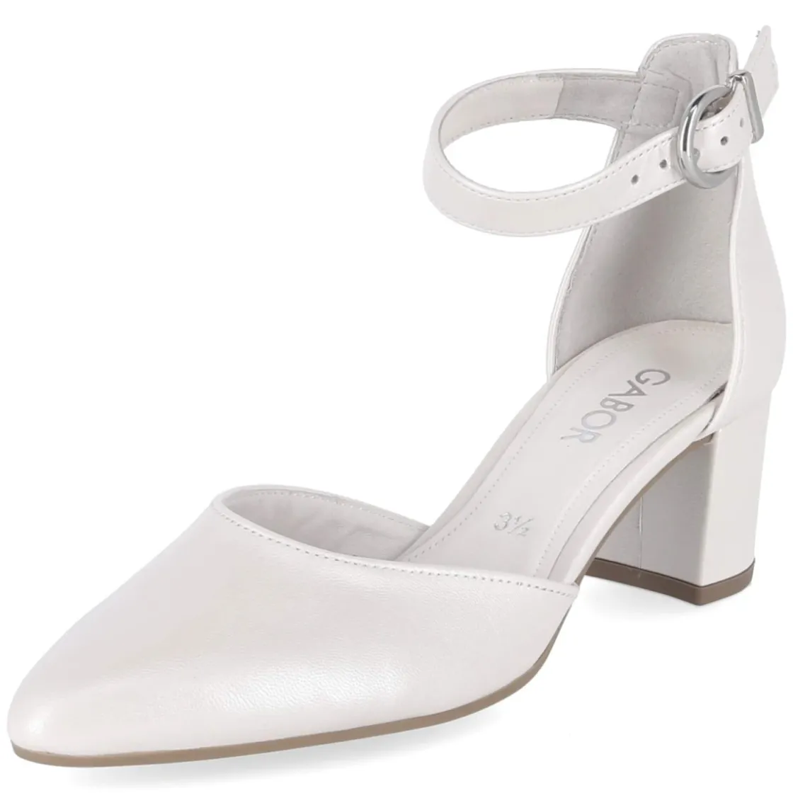 Zeitlose Eleganz mit Komfort verbindet dieser Riemchenpumps von Gabor in strahlendem Weiß mit edler Ivory-Nuance. Glattes, langlebiges Echtleder verleiht eine gepflegte, elegante Optik, während die lederne Decksohle ein angenehm natürliches Fußklima unterstützt. Die spitz zulaufende Form streckt visuell das Bein, der 6 cm hohe Blockabsatz bietet Standfestigkeit für lange Anlässe von Büro bis Feier. Ein Riemchen mit Schnalle und praktischem Druckknopf sorgt für verlässlichen Halt und unkompliziertes An- und Ausziehen, die flexible Laufsohle federt Schritte sanft ab. Der Passformhinweis fällt normal aus, wodurch die Größenauswahl mühelos gelingt. Modetipp: Besonders harmonisch wirkt der Pumps zu einem cremefarbenen Satinkleid, einem weißen Hosenanzug oder einem pastelligen Midirock; dezenter Goldschmuck setzt die Ivory-Töne stilvoll in Szene.