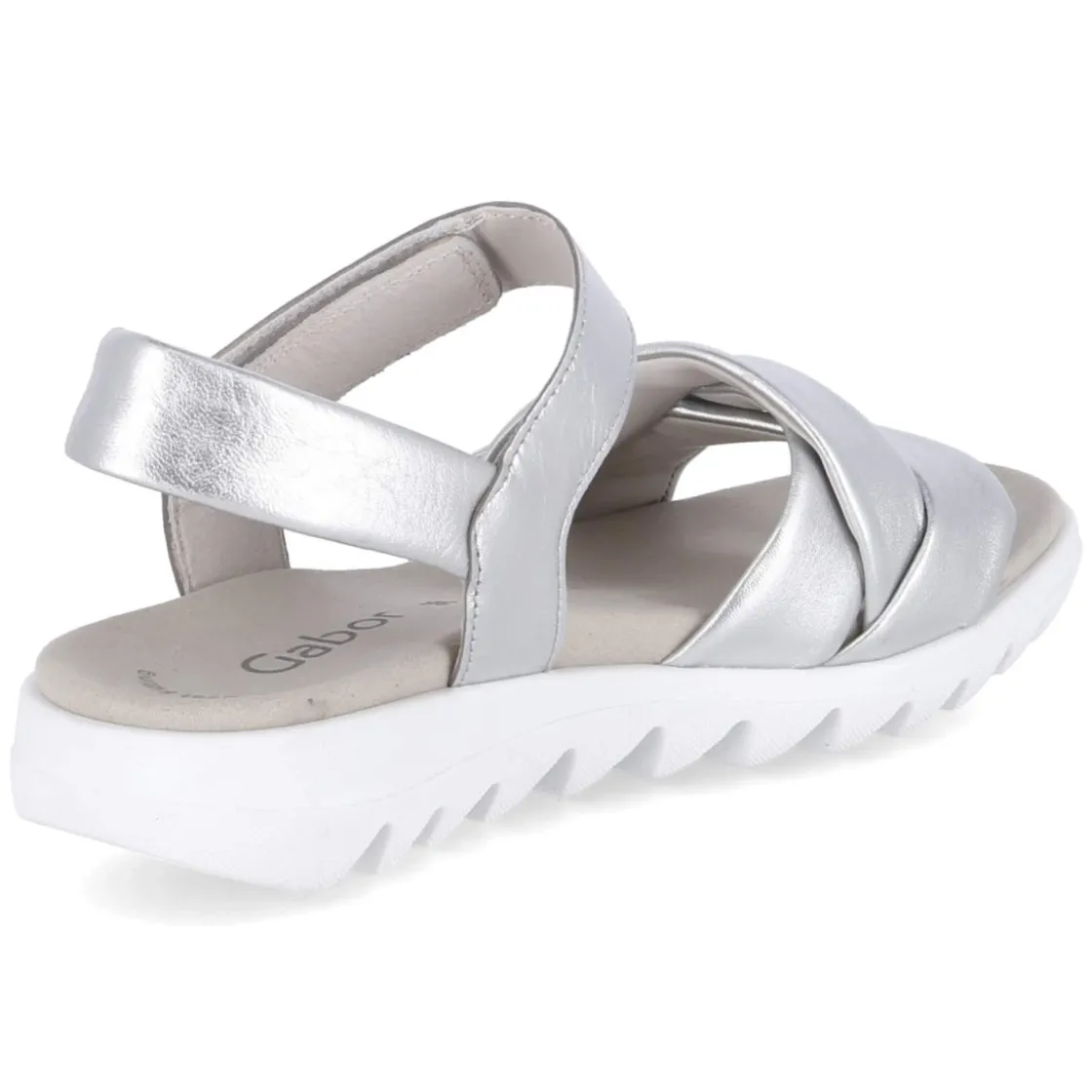 Die silbernen Sandalen von Gabor verbinden eleganten Metallic-Schimmer mit hohem Tragekomfort. Das Obermaterial aus Glattleder zeigt eine edel glänzende Oberfläche, während die offene Schuhspitze und verflochtene Riemen vorne dem Fuß Leichtigkeit verleihen. Ein bequemer Klettverschlussriemen ermöglicht schnelles An- und Ausziehen und sorgt zusammen mit dem leicht wattierten Fersenriemen für sicheren Halt. Die vorgeformte, gepolsterte Decksohle aus Textil unterstützt den Fuß natürlich, die flexible, rutschfeste Profilsohle begleitet jeden Schritt angenehm. Das Modell fällt größengetreu aus und eignet sich ideal für warme Tage, an denen Stil und Komfort gefragt sind. Modetipp: Zu einem fließenden Midi-Kleid in Pastell und einer schlichten Clutch entsteht ein moderner Sommerlook, der den silbernen Glanz wirkungsvoll unterstreicht.