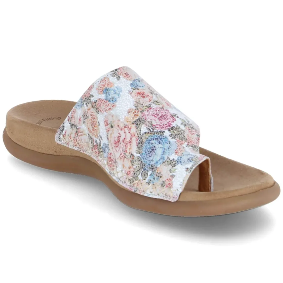 Dieser Zehentrenner von Gabor vereint sommerliche Leichtigkeit mit hochwertiger Verarbeitung. Das glatte Obermaterial aus langlebigem Echtleder präsentiert sich in klassischem Weiß, veredelt durch einen bunten Blumenprint, der die trendige Retro-Optik stilsicher unterstreicht. Die offene Schuhspitze und das Design ohne Verschluss sorgen für unkompliziertes Hineinschlüpfen. Innen punktet eine Textil-Decksohle, während das vorgeformte, weiche Fußbett den Fuß angenehm stützt. Die flexible, griffige Laufsohle bietet Halt auf verschiedensten Untergründen. Mit normaler Passform eignet sich das Modell hervorragend für den Alltag wie für den Strandspaziergang. Modetipp: Zu einem luftigen Leinenkleid in Naturtönen und einer Flecht-Tote entfaltet der florale Print seine volle Wirkung.