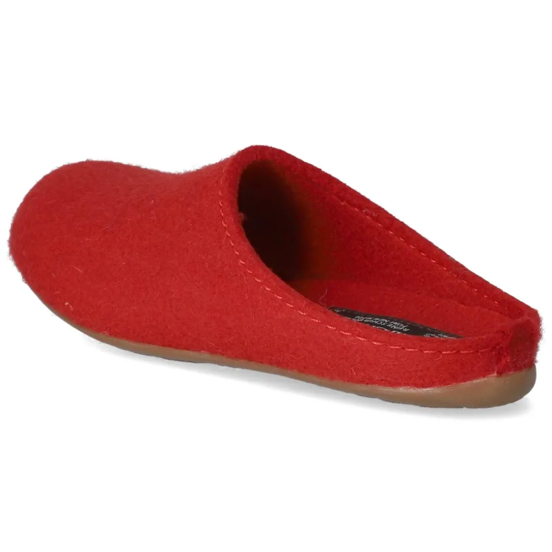 Die Pantoletten EVEREST FUNDUS von Haflinger kombinieren zeitloses Design mit spürbarer Bequemlichkeit. Der rote Textilbezug in markanter Filzoptik wirkt warm und wohnlich, während der griffige Stoff am Fuß Halt vermittelt. Durch den unkomplizierten Einstieg ohne Verschluss gelingt das Hineinschlüpfen im Alltag besonders schnell. Die runde Schuhspitze lässt den Zehen Raum, das leicht gepolsterte Fußbett unterstützt sanft und kann dank Wechselfußbett nach Bedarf ausgetauscht werden – ideal auch für eigene Einlagen. Eine flexible, griffige Laufsohle sorgt auf Parkett wie auf kurzen Wegen nach draußen für zuverlässige Traktion. Das Modell fällt normal aus und richtet sich an erwachsene Damen, die Wert auf Komfort und Schlichtheit legen. Modetipp: Zum roten Ton passen naturfarbene Strickteile und eine lässige Jeans, dazu ein schmaler Gürtel in Cognac für einen harmonischen, entspannten Look.