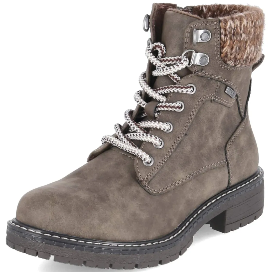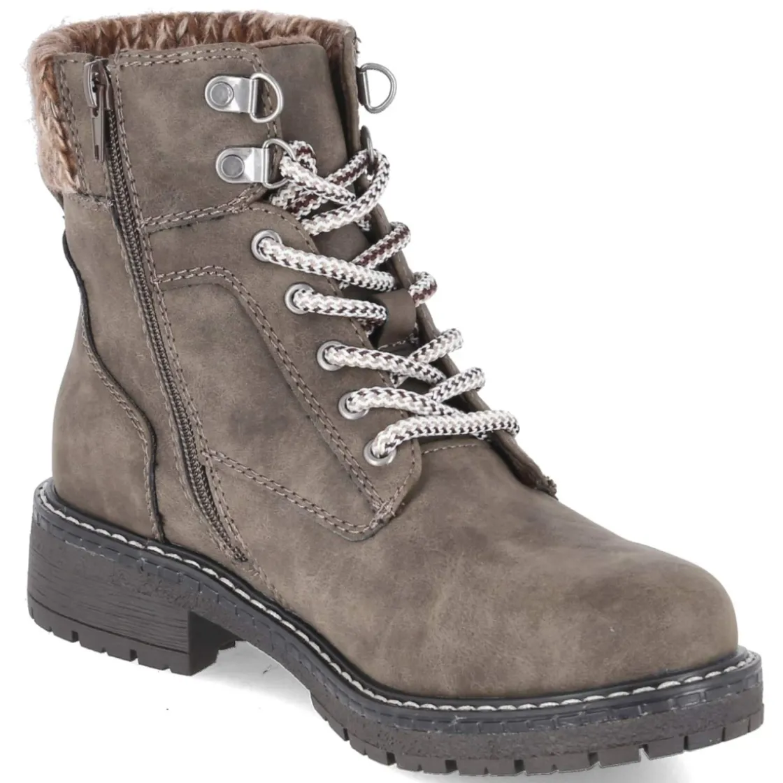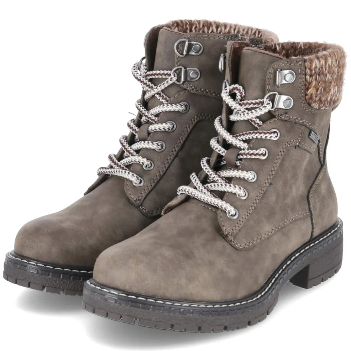 Die Schnürboots von Jane Klain verbinden urbanen Look mit verlässlichem Wetterschutz. Das melierte Taupe bringt Tiefe in den Farbton und lässt sich mühelos kombinieren. Der wasserfeste Material-Mix aus Textil und Synthetik schützt bei Nieselregen, während leichtes Warmfutter an kühlen Tagen angenehm wärmt. Durch Schnürsenkel und seitlichen Reißverschluss gelingt das An- und Ausziehen komfortabel. Ein weiches Fußbett, die textile Decksohle und ein gepolsterter Einstieg in Strick sorgen für bequemes Tragegefühl, unterstützt vom verstärkten Fersenbereich. Mit 3,5 cm Blockabsatz, runder Spitze und rutschfester Profilsohle entsteht stabiler Halt. Ziernähte setzen dezente Akzente, die den cleanen Look unterstreichen. Fällt größengetreu aus und zeigt vielseitige Kombinationsstärke zu Alltags- und Freizeitstyles. Modetipp: Perfekt zu knöchellanger Mom-Jeans, wollweißem Pullover und gesteppter Weste für einen harmonischen Ton-in-Ton-Auftritt.