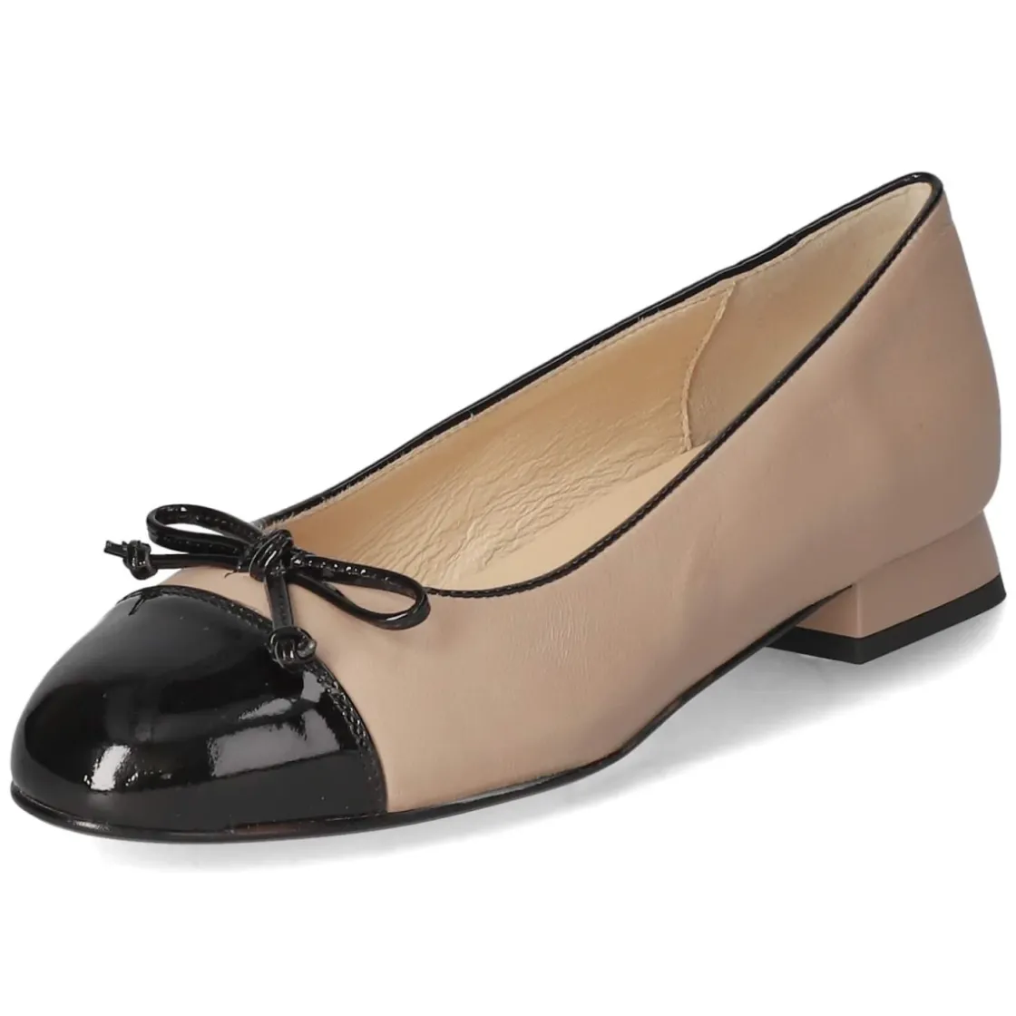 Die Ballerinas von Kaerlek verbinden zeitlose Eleganz mit komfortabler Alltagstauglichkeit. Glattes Leder in edler Lackoptik sorgt für einen feinen Glanz, während der schwarzfarbene Einstieg in Lackoptik einen stilvollen Kontrast zum warmen Beige bildet. Die runde Schuhspitze mit verstärktem Zehenbereich und die verstärkte Ferse geben zusätzliche Formstabilität. Ein 1,5 cm hoher Blockabsatz bietet dezenten Lift und sicheren Auftritt, die flexible Laufsohle unterstützt ein geschmeidiges Abrollen. Innen umschmeichelt Leder den Fuß, die hautfreundliche Lederdecksohle und das gepolsterte Lederfußbett stehen für angenehmen Tragekomfort. Ohne Verschluss gelingt der Einstieg unkompliziert, die Passform fällt normal aus. Modetipp: Zu gekrempelten Zigarettenhosen und einer feinen Bluse tragen, dazu eine schmale Clutch – so entsteht ein eleganter City-Look.