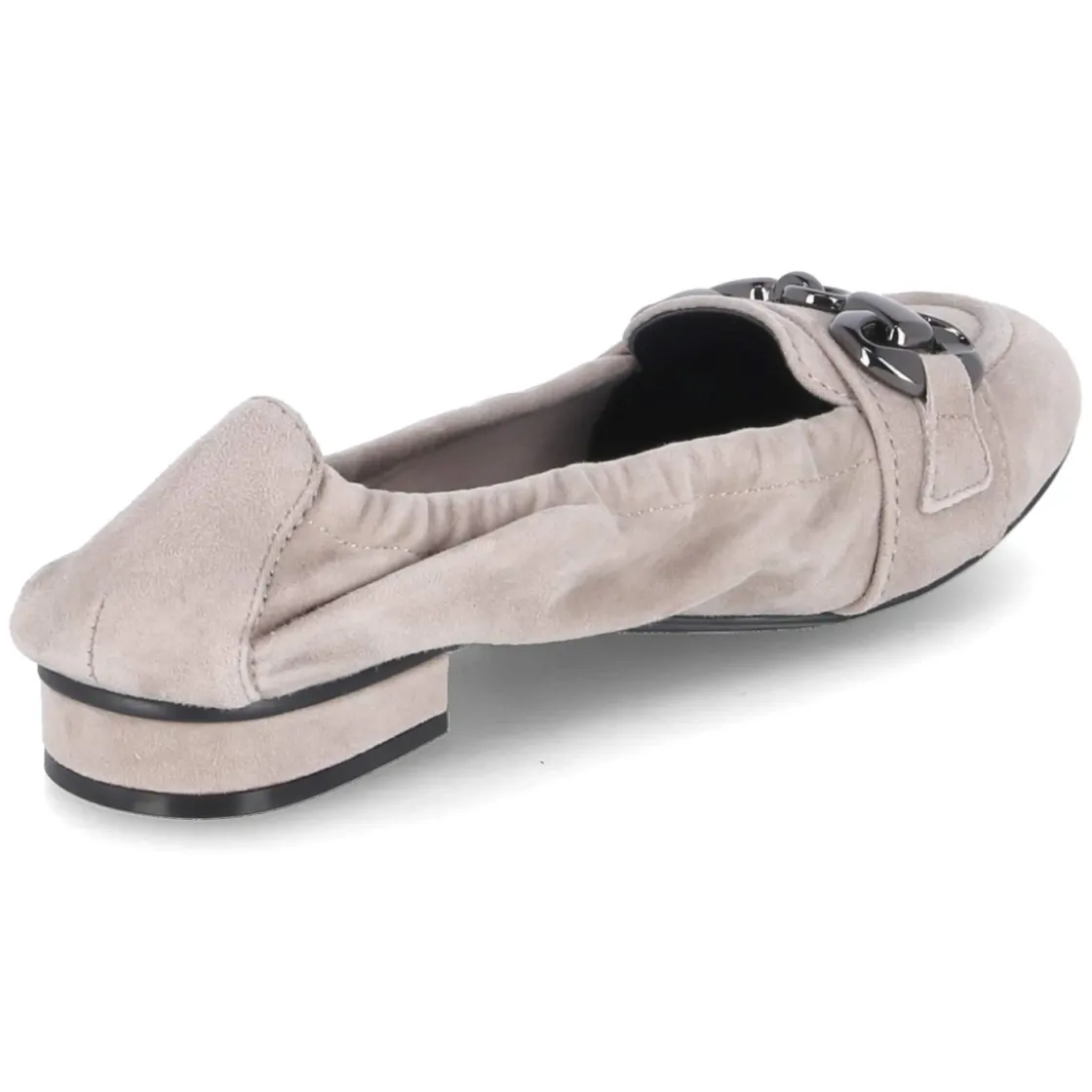 Die Ballerinas von Kaerlek verbinden subtile Raffinesse mit hohem Tragekomfort. Weiches Rauleder in sanftem Beige und eine runde Spitze sorgen für eine edle, zeitlose Anmutung. Das langlebige Echtleder wird von einer gepolsterten Lederdecksohle ergänzt, die zusammen mit dem elastischen Einstieg und der verstärkten Ferse sicheren Halt bietet. Ein 2 cm hoher Blockabsatz und die sehr flexible, rutschhemmende Laufsohle machen das Modell alltagstauglich – vom Office bis zum Dinner. Charakteristisches Detail ist die kleine Zunge mit Zierriemen und Metallelement in glänzender Titanoptik, die den Stil modern abrundet. Ohne Verschluss, fällt normal aus und schmiegt sich angenehm an den Fuß. Modetipp: zu verkürzten Zigarettenhosen und einem feinen Stricktop kombinieren; ein Trenchcoat in Sandtönen komplettiert den eleganten Look.