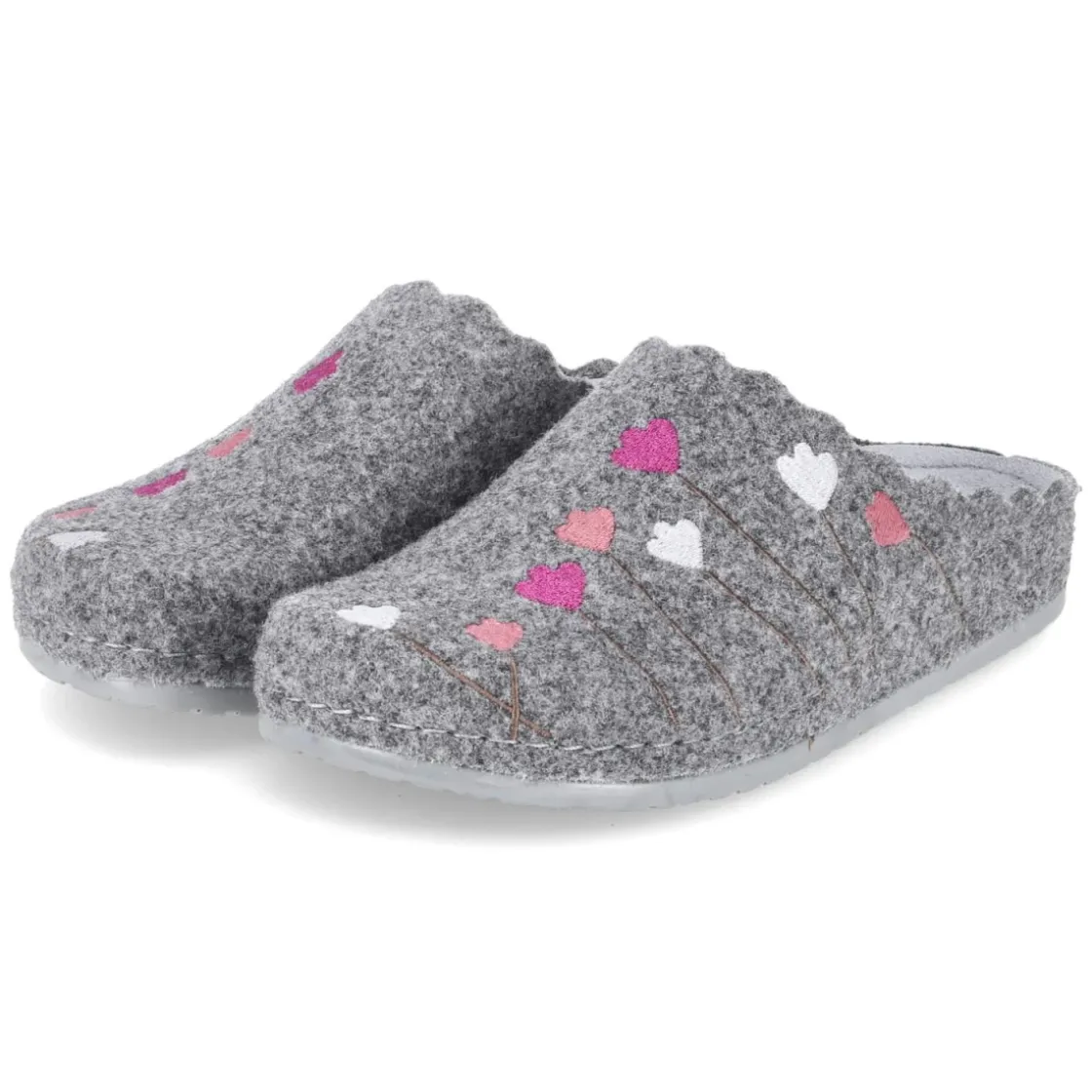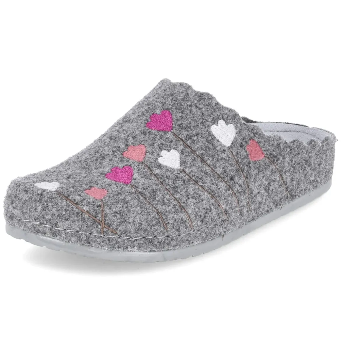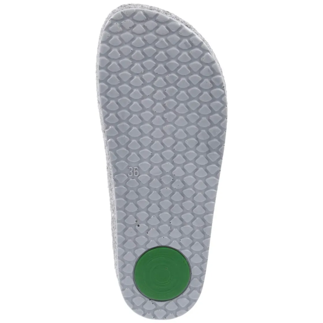 Pantoffeln NANA von Kaerlek stehen für gemütliche Stunden und zeitloses Design. Das robuste Filz-Textilobermaterial schmiegt sich angenehm an und zeigt mit seitlicher Blumenstickerei und feinem Motiv einen zurückhaltenden Akzent im grauen Ton. Die runde Spitze schafft Zehenfreiheit, während ein Elastikeinsatz am Spann für sicheren Halt sorgt. Im Inneren unterstützt eine vorgeformte, weiche Decksohle aus Leder das Fußgewölbe und macht jeden Schritt zuhause besonders komfortabel. Die flexible Laufsohle passt sich der Bewegung an und bietet leises, trittsicheres Gehen auf unterschiedlichen Böden. Dank schlupffreundlicher Machart ohne Verschluss ist schnelles Hineinschlüpfen möglich, zudem fällt das Modell normal aus. Modetipp: Zu Lounge-Hosen aus Strick und einem melierten Oversize-Pullover kombinieren, dazu Wollsocken in einem hellen Grauton für einen monochromen, eleganten Home-Look.