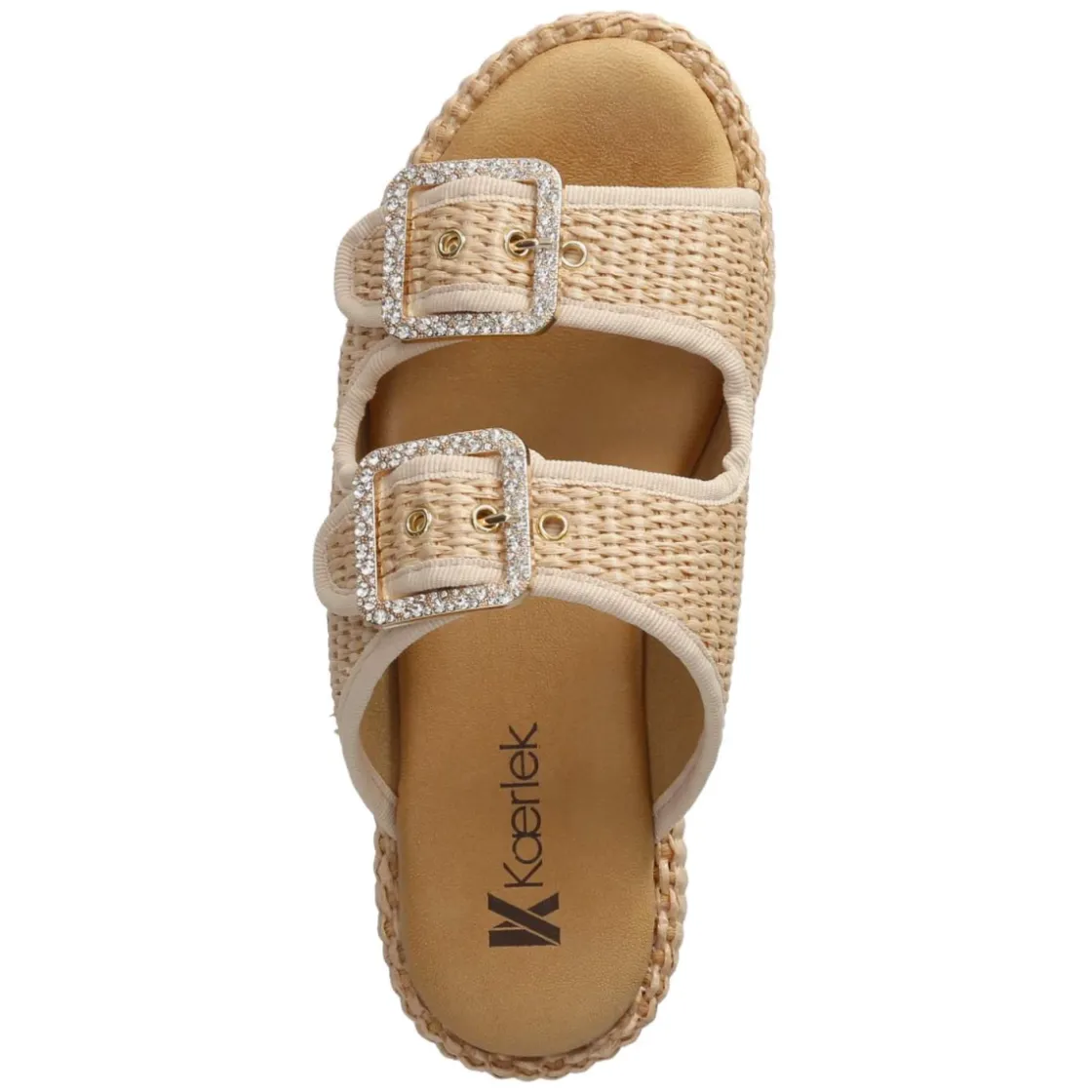 Die Pantoletten NATURALE von Kaerlek verbinden sommerliche Leichtigkeit mit modernem Design. Das beige Obermaterial aus hochwertig modern designter Synthetik zeigt eine feine Sisaloptik, die zusammen mit dem 4,5 cm hohen Plateau eine natürliche Textur und angenehme Höhe bringt. Die offene Schuhspitze unterstreicht den luftig-freien Charakter, während zwei goldfarbene Schnallen mit glitzernden Schmucksteinen einen eleganten Akzent setzen. Dank sicherer Schnallen lässt sich die Weite individuell anpassen, das gepolsterte Fußbett und die Decksohle aus Leder sorgen für dauerhaften Tragekomfort. Die Passform fällt normal aus und begleitet mühelos durch Alltag und Stadtbummel. Modetipp: zu fließenden Leinenkleidern oder Culottes und einer Basttasche kombinieren – die neutrale Beige-Nuance und die Sisaloptik harmonieren perfekt mit natürlichen Materialien.