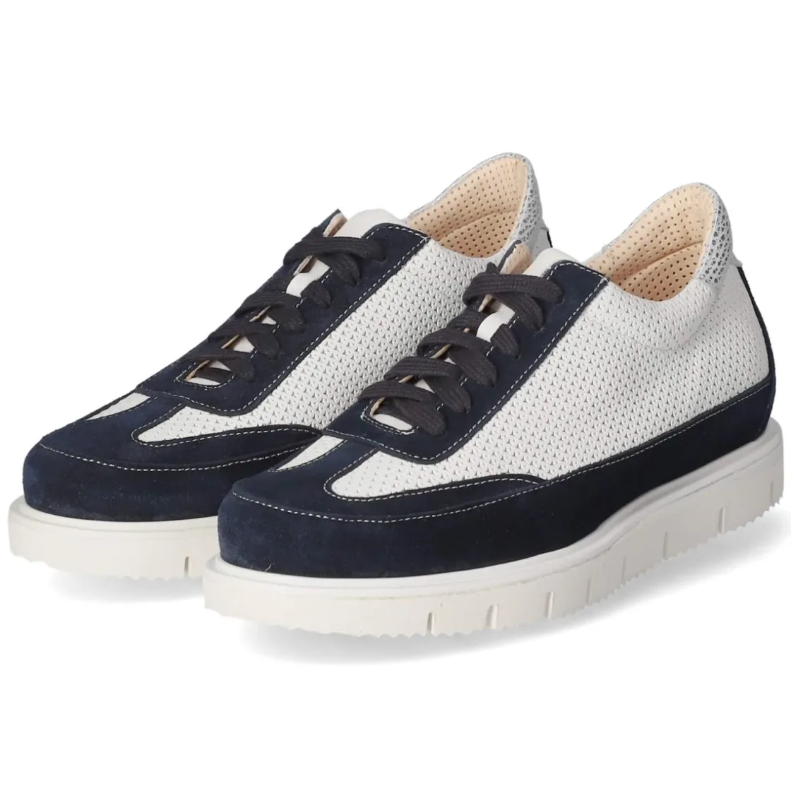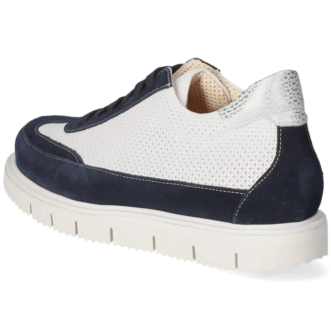 Der Damen-Schnürschuh von Kaerlek in kühlem Blau verbindet feine Optik mit durchdachter Funktion. Weiches, atmungsaktives Echtleder trifft auf rund gearbeitete Schuhspitze und partiell gelochte Einsätze, die für angenehmes Fußklima sorgen. Dunkelblaues Rauleder setzt edle Akzente, während der gepolsterte Einstieg und die rutschhemmend flexible Laufsohle Komfort auf Schritt und Tritt bieten. Die Schnürung erlaubt eine individuelle Anpassung, der verstärkte Fußrahmen sowie Zehen- und Fersenbereich schenken Stabilität. Innen verwöhnt eine hautfreundliche Lederdecksohle, die als gepolsterte Wechseldecksohle herausgenommen werden kann. Das Modell fällt normal aus und passt sich dank Wechselfußbett unterschiedlichen Bedürfnissen an. Modetipp: Besonders stimmig zu cropped Straight-Jeans und heller Hemdbluse tragen, für einen entspannten City-Look mit feinem Kontrast.