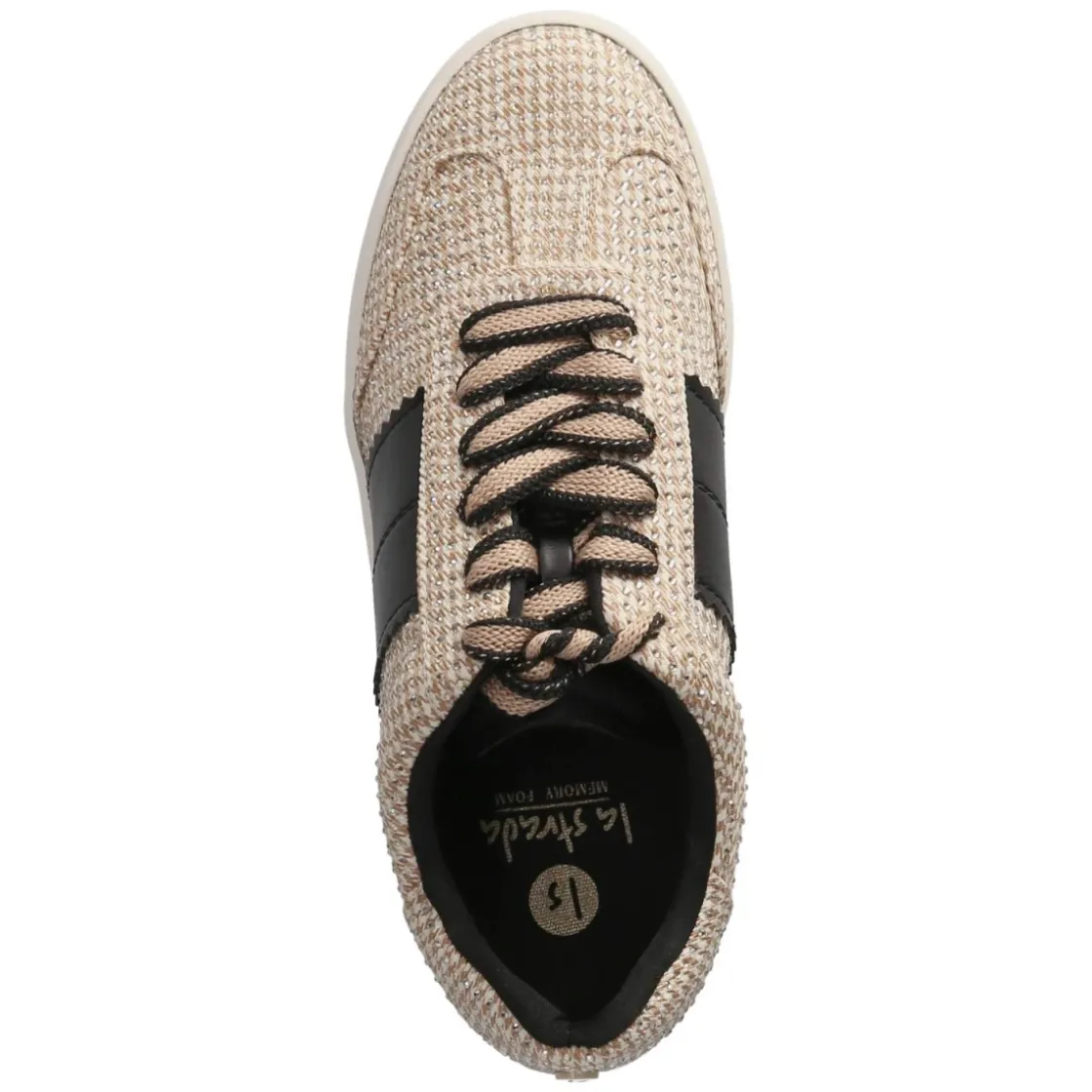 Dieser Damen-Sneaker von La Strada bringt Glamour in den Alltag: Die goldfarbene, glitzernde Oberfläche harmoniert mit Hahnentrittmuster, goldfarbenen Schmucksteinen und schwarzen Zierstreifen. Das Obermaterial aus Textil und die runde Schuhspitze sorgen zusammen mit der Textil-Decksohle für angenehmen Tragekomfort. Gepolsterter Einstieg und gepolstertes Fußbett umschmeicheln den Fuß, während ein verstärkter Zehen- und Fersenbereich zusätzliche Stabilität verleiht. Die flexible, rutschhemmende Laufsohle bietet sicheren Halt auf verschiedensten Untergründen. Der Sneaker schließt mit Schnürsenkeln und fällt normal aus – ideal für erwachsene Damen, die bei jedem Schritt einen perfekten Auftritt wünschen. Modetipp: Zu einer schwarzen Zigarettenhose und einem seidigen Blazer entsteht ein edler Kontrast; für den Abend ergänzt ein Satin-Midi-Rock den goldenen Schimmer besonders stilvoll.