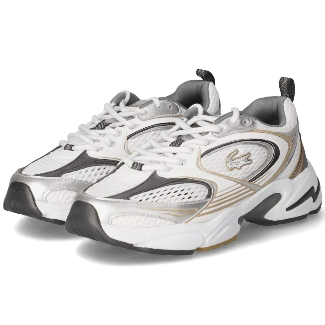 Der Low Sneaker STORM von Lacoste verbindet eine klare weiße Basis mit einem mehrfarbigen Spiel aus grauen und schwarzen Details sowie edlen Akzenten in Silber und Gold. Das Obermaterial aus leichtem Textil‑Synthetik‑Mix mit atmungsaktiven Mesh-Parts sorgt für ein angenehmes Klima, während der bequem gepolsterte Einstieg und das weich gepolsterte Fußbett Komfort im Alltag bieten. Die runde Spitze, die klassische Schnürung für individuelle Anpassung und die praktische Anziehlasche unterstreichen die sportive Silhouette. Eine flexible, rutschfeste Laufsohle verleiht Halt auf unterschiedlichsten Untergründen, die textile Decksohle rundet das Tragegefühl ab. Der Schnitt fällt normal aus und richtet sich an Damen, die einen urbanen, dynamischen Look bevorzugen. Modetipp: Besonders stimmig zu cleanen Wide-Leg-Jeans und einem strukturierten Blazer; Metallic-Details können in Tasche oder Schmuck subtil aufgegriffen werden.